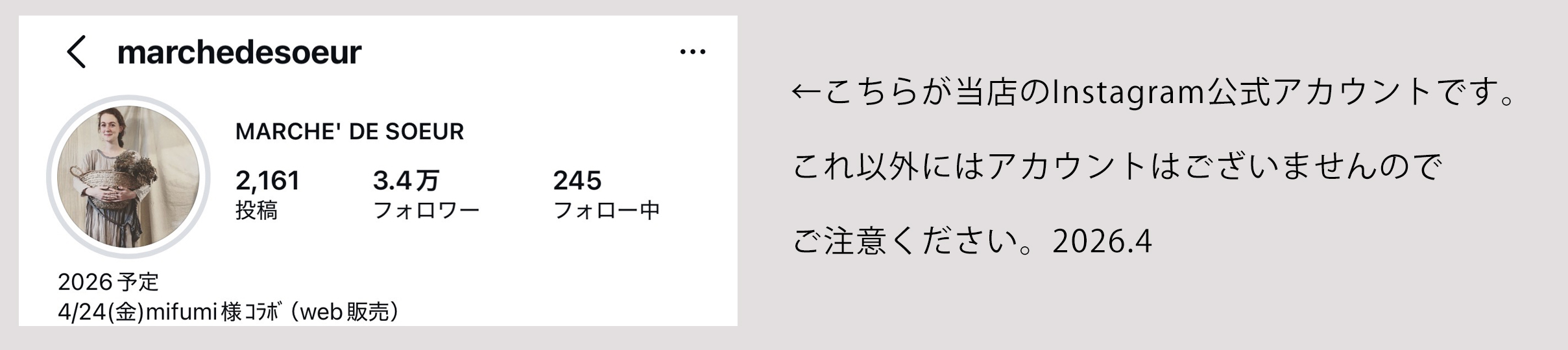 New & Pick up 完売した商品は各カテゴリに移動しています Crea delice/ジャガードフードジャケット・ベージュ [PEP260301] 9,790円(税込) 【4/8再入荷】xilent thinker/バングル 1,650円~4,990円(税込) MARCHE' DE SOEUR/大きなラッフル襟のチュニック・ファナージュミルクにワッフルベージュ襟 [MDS260325] 22,800円(税込) MARCHE' DE SOEUR/大きなラッフル襟のチュニック・ファナージュミルクに薄グレー襟 [MDS260329] 22,800円(税込) MARCHE' DE SOEUR/大きなラッフル襟のチュニック・ベージュローズに生成り襟 [MDS260327] 22,800円(税込) MARCHE' DE SOEUR/大きなラッフル襟のチュニック・ワッフルブラックに黒ガーゼ襟 [MDS260326] 22,800円(税込) MARCHE' DE SOEUR/大きなラッフル襟のチュニック・ワッフルベージュに生成り襟 [MDS260324] 22,800円(税込) MARCHE' DE SOEUR/大きなラッフル襟のチュニック・ファナージュピンクに生成り襟 [MDS260328] 22,800円(税込) MARCHE' DE SOEUR/ピエロパンツ・ベージュブロックチェック [MDS260206] 21,800円(税込) MARCHE' DE SOEUR/ピエロパンツ・グレージュピンクローズ [MDS260208] 22,800円(税込) MARCHE' DE SOEUR/ピエロパンツ・黒ブーケ刺繍 [MDS251220] 21,800円(税込) MARCHE' DE SOEUR/ハックルベリーパンツ・ヴィンテージブラック [MDS251011] 23,800円(税込) MARCHE' DE SOEUR/ハックルベリーパンツ・デニム [MDS251013] 23,800円(税込) MARCHE' DE SOEUR/ポケットスカート・オフ [MDS260321] 16,800円(税込) HALLELUJAH/1890's Bourgeron 羊飼いシャツワンピース・flax [HAL250702] 36,000円(税込) nous rendent heureux/りぼんフリル襟ブラウス・ライトグレー [SLS260305] 15,400円(税込) nous rendent heureux/エプロンワンピース・オフ [SLS260306] 17,380円(税込) monami/コットンUVセミロングアームカバー・ダブルレース 2,860円(税込) monami/コットンUVロングアームカバー・ボタン 2,860円(税込) monami/コットンUVロングアームカバー・3段ギャザー 2,860円(税込) monami/コットンUVロングアームカバー・リボン 2,970円(税込) Branch m'/さらっとリネンアームカバー 2,750円(税込) Branch m'/リネンガーゼスヌード・ライトブルー [OTH260321] 4,290円(税込) Branch m'/リネンガーゼストール・ライトピンク [OTH260324] 3,300円(税込) Branch m'/リネンガーゼストール・ブラック [OTH260323] 3,300円(税込) SO/大判ストール・ナチュラル [COF250934] 5,390円(税込) Crea delice/パイピングりぼんブラウス・アッシュピンク [PEP260303] 8,690円(税込) Crea delice/パイピングりぼんブラウス・オフ [PEP260302] 8,690円(税込) Crea delice/ドルマン袖のカーディガン・チャコール [PEP260307] 7,590円(税込) Branch m'/リネンチュニック・生成り [OTH250325] 16,500円(税込) manoamano/1段レースドロワーズペチパンツ・オリーブ [OTH260124] 9,800円(税込) seasew./109 デニムオーバーオール・インディゴ [STI250918] 23,100円(税込) seasew./106 カシュクールワンピース・ブラック [STI260115] 20,900円(税込) seasew./508 オックスコクーンパンツ・キナリ [STI260201] 11,000円(税込) seasew./510 ホワイトデニムコクーンパンツ [STI260101] 14,850円(税込) ubasoku/0020 2wayポケットジャンパースカート・黒 [BNT260203] 14,300円(税込) 08mab/リネンフードプルオーバー・ベージュ [8MA250918] 12,980円(税込) SO/ドッキングタックワンピース・ブラック [COF260201] 9,790円(税込) SO/フリル襟ブラウス・ブラック [COF250705] 5,390円(税込) SO/コットンローンギャザーブラウス・スミクロ [COF250643] 6,490円(税込) le ciel a tempsdoux/刺繍レース2wayスカート・オフ [DEA260113] 10,450円(税込) le ciel a tempsdoux/刺繍レース2wayスカート・黒 [DEA260114] 10,450円(税込) le ciel de demain/リネンパイピングブラウス・生成り [DEA260110] 9,790円(税込) ubasoku/0116 ノースリーブワンピース・インディゴ [BNT251006] 14,300円(税込) ubasoku/0054 ウエストリブボリュームパンツ・ブロックチェック [BNT260213] 13,200円(税込) ubasoku/0152 フードデニムジャケット・インディゴ [BNT251013] 13,200円(税込) seasew./301 ダブルガーゼブラウス・ミント [STI260112] 15,180円(税込) seasew./301 ダブルガーゼブラウス・サックス [STI260114] 15,180円(税込) seasew./301 ダブルガーゼブラウス・オフ [STI260113] 15,180円(税込) seasew./527 ワッシャーコットンワイドペチパンツ・キナリ [STI260303] 5,940円(税込) seasew./527 ワッシャーコットンワイドペチパンツ・オフ [STI260304] 5,940円(税込) seasew./527 ワッシャーコットンワイドペチパンツ・チャコール [STI260302] 5,940円(税込) seasew./202 スキッパーブラウス・ブルー [STI260201] 14,080円(税込) seasew./202 スキッパーブラウス・杢ブラック [STI260201] 14,080円(税込) 08mab/重ね着風ワンピース・インディゴ×オフ [8MA260206] 16,280円(税込) sorte cuff/バルーンパンツ・ブロックチェック [8MA260208] 11,880円(税込) seasew./104 デニムテーラードジャケット・インディゴ [STI250813] 25,300円(税込) sleep slope/ベルギーリネンのホイップベレー・ベージュ [OTH260128] 7,920円(税込) ecru-ke/木彫りのブローチ 2,750円~3,080円(税込) antique/ルルドの泉のメダイネックレス 9,800円(税込) caco grass works/ヴィンテージガラスボタンのピアス [CAC220419] 6,380円(税込) xilent thinker/ネックレス 1,650円~4,990円(税込) xilent thinker/リング 1,500円~5,490円(税込) xilent thinker/バングル 3,500円(税込) xilent