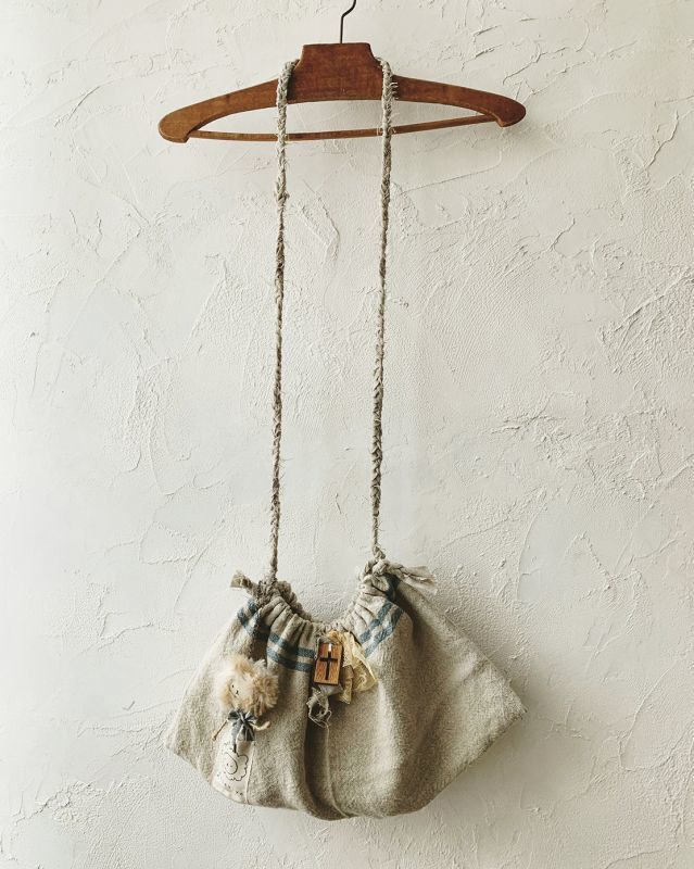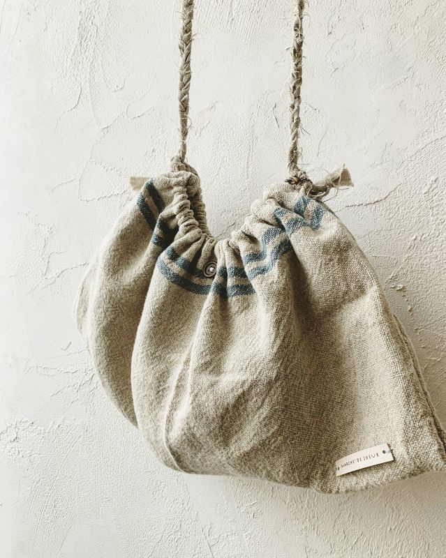 青いラインの入ったハードリネンのきんちゃくショルダー*