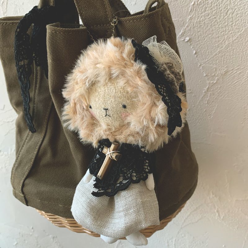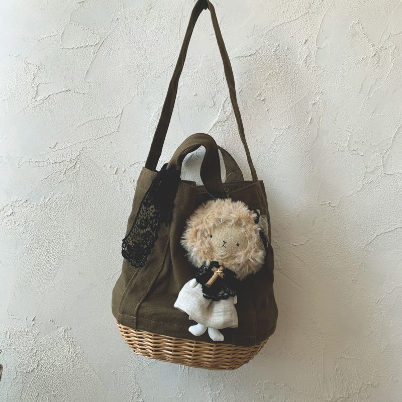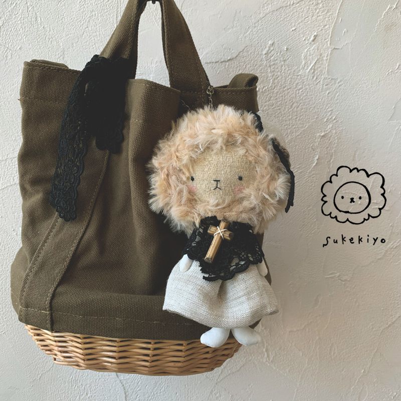 スケキヨのバッグチャームとアンティークレースをあしらいました*