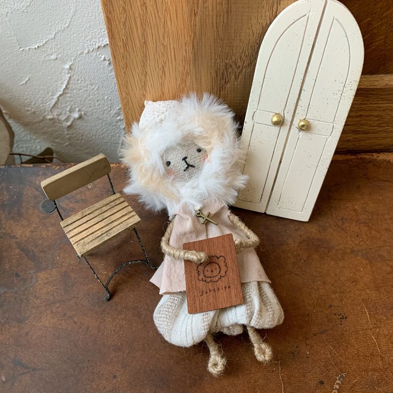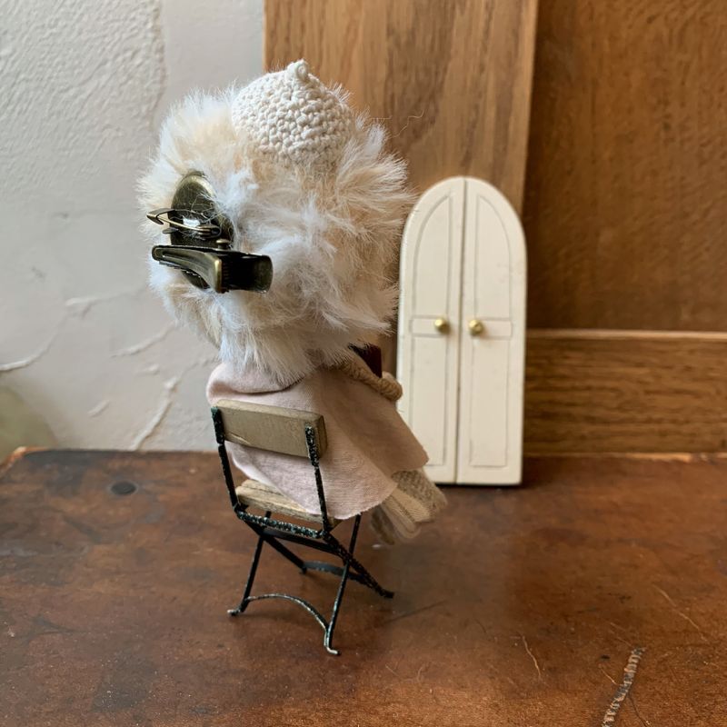 おしゃれなお帽子に刻印カードを持って、小さな木の椅子に