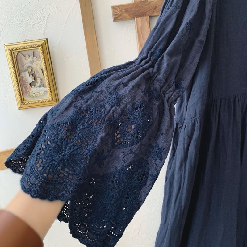 ひらひらお袖と裾のベル刺繍がとっても素敵なワンピースです。
