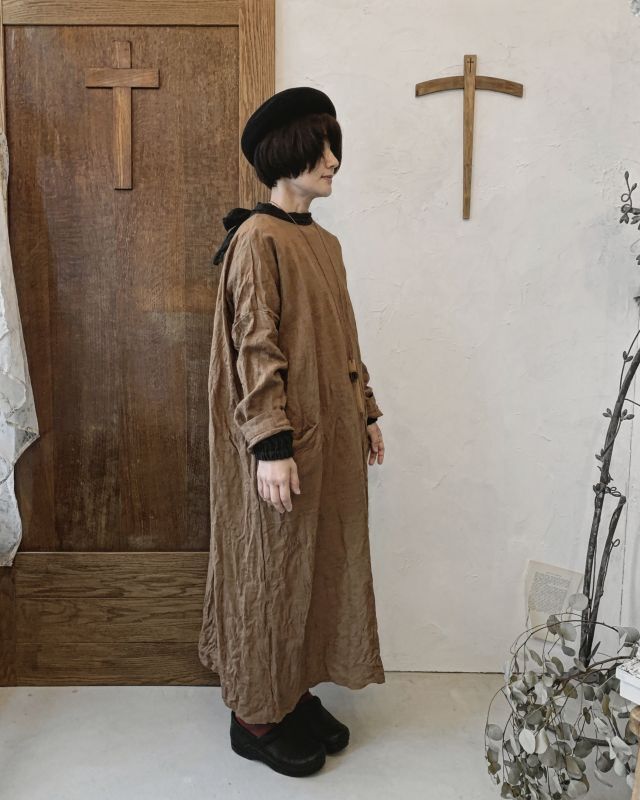 リボンで結ぶタイプの後ろ開きドロップショルダーの柿渋染めワンピース。