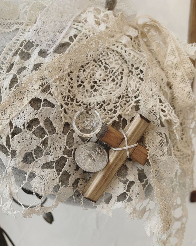 やわらかいウールベレーに、アンティークレースやアンティークメダイ、