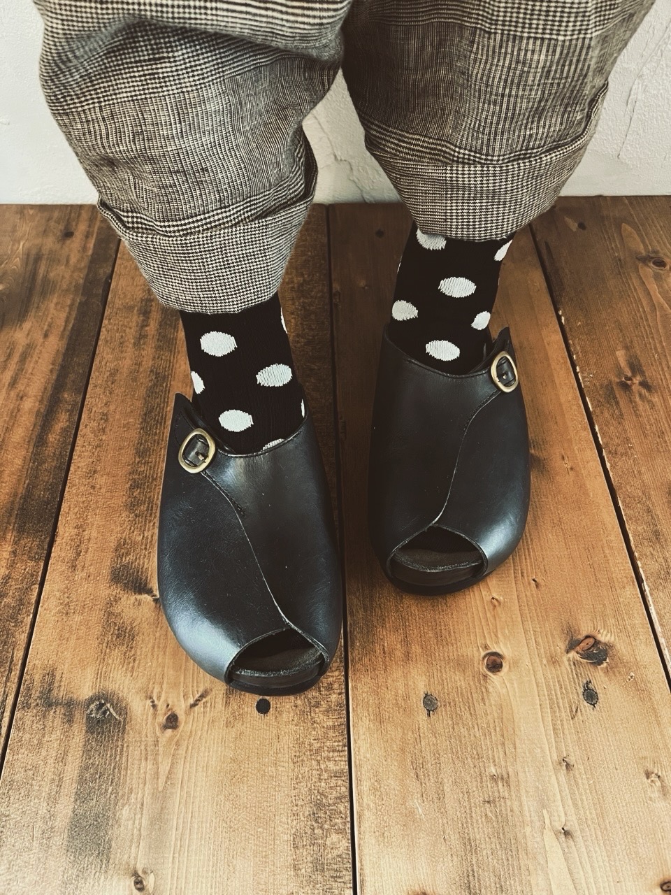 オープントゥなのでカラーや柄物ソックスを覗かせても