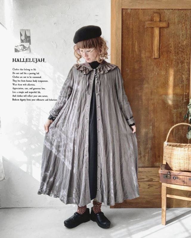 ヨーロッパ中世のローブをリデザインし、アレンジを加えたフードドレス。