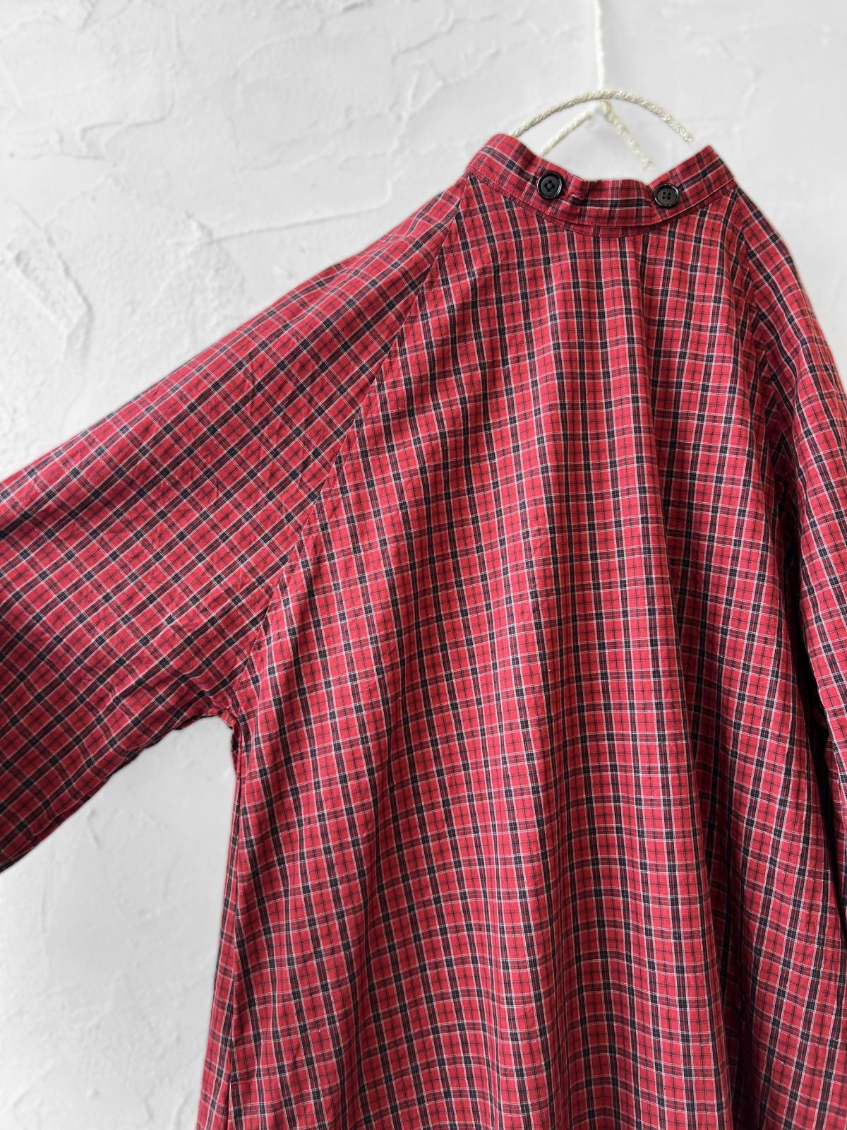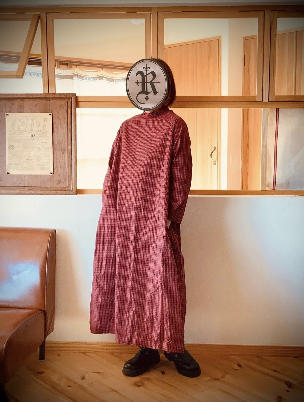 襟の小さなボタンにリボンを留め、後ろで結ぶデザイン。