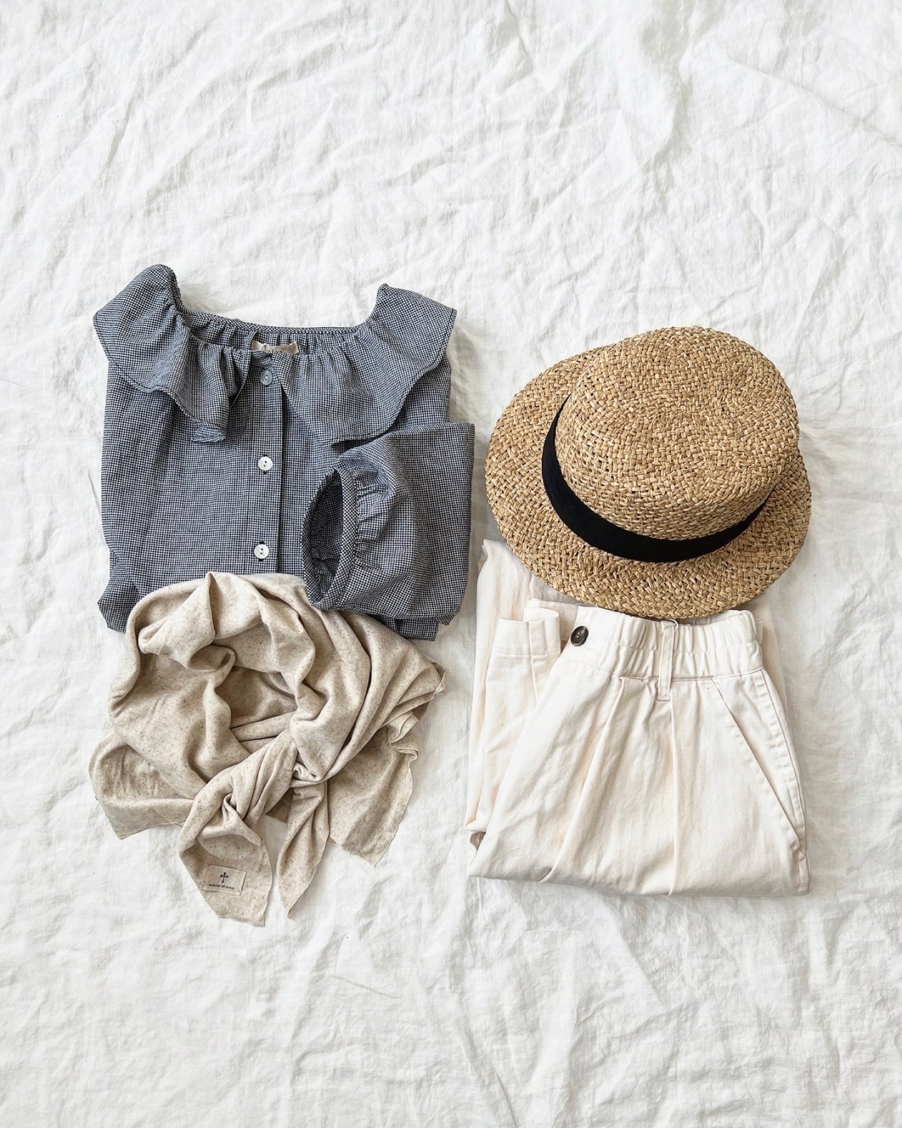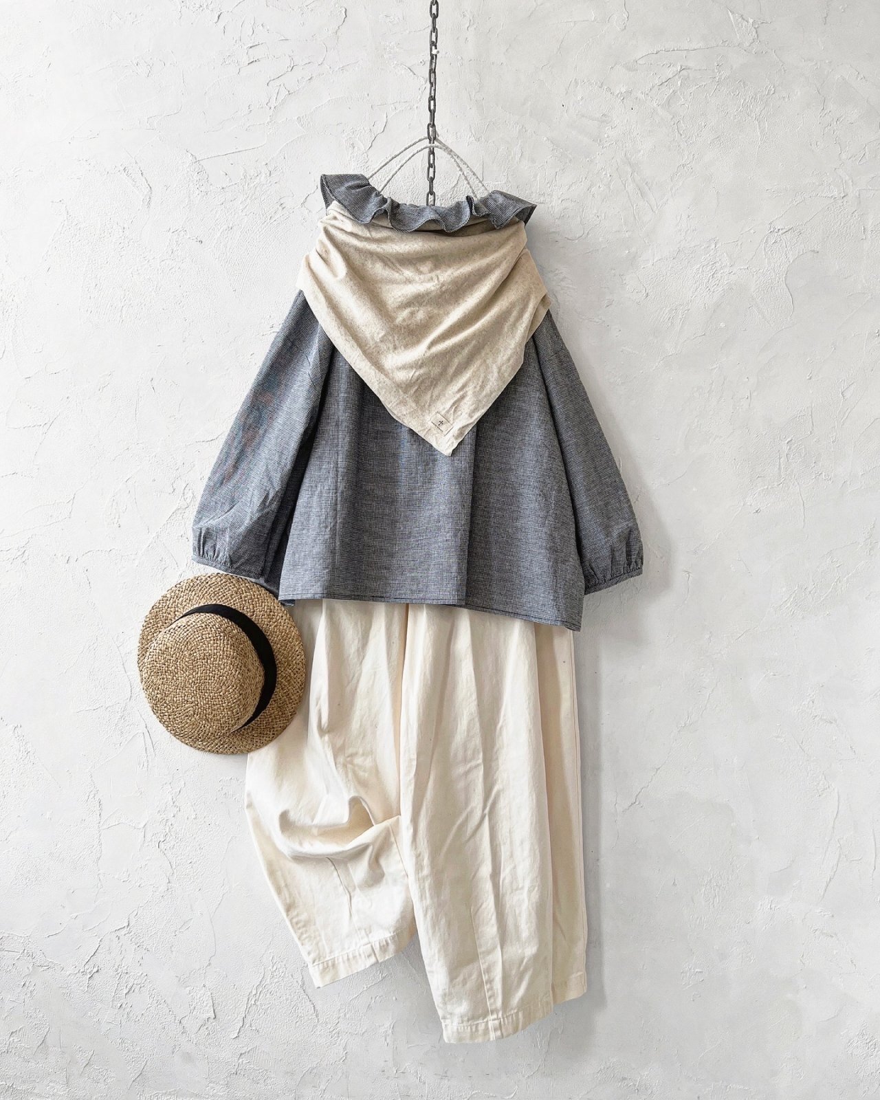 フリル襟ブラウスとパンツ、大判ストールにカンカン帽の