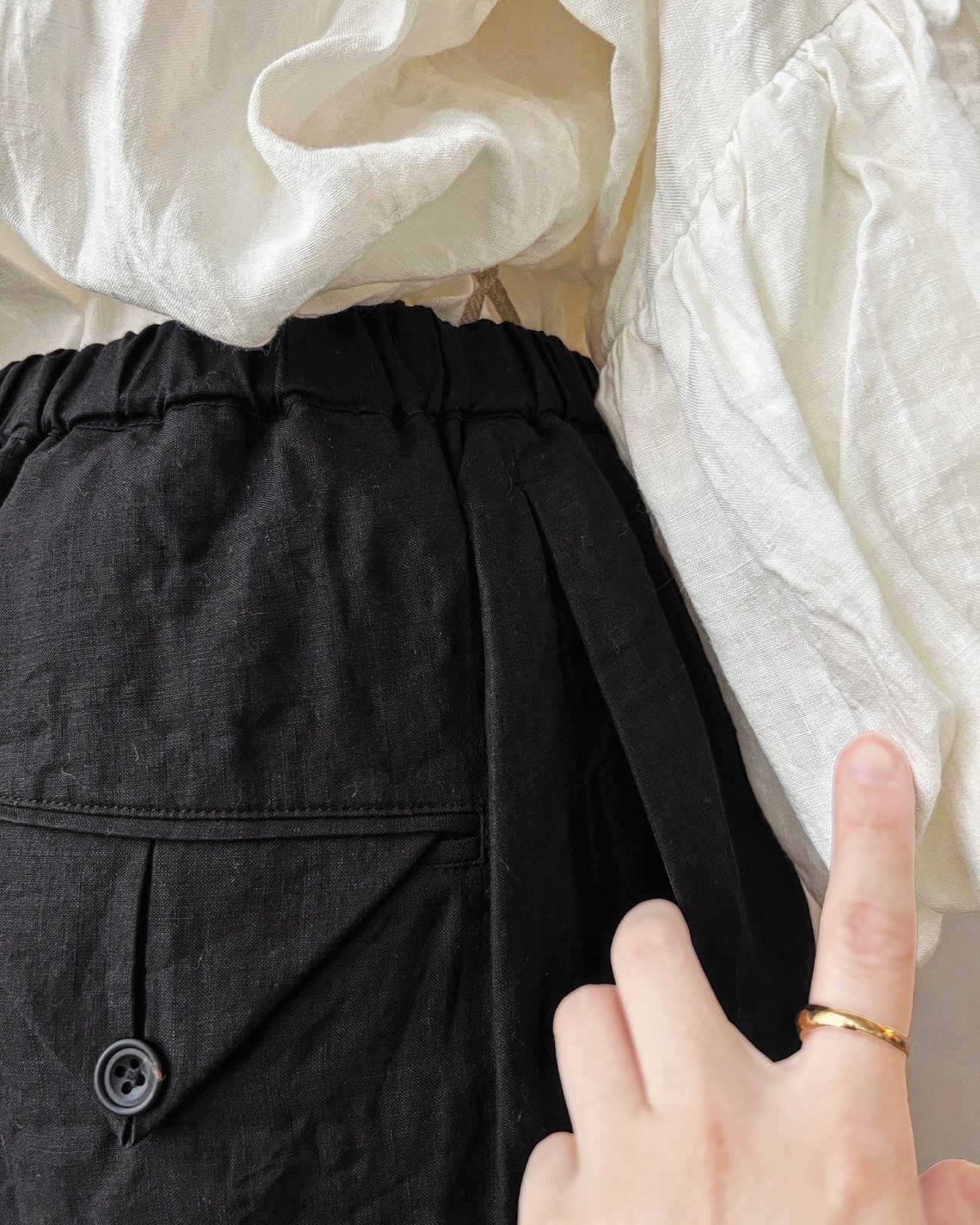 ウエストは総ゴム+紐できゅっと絞ることもできます。