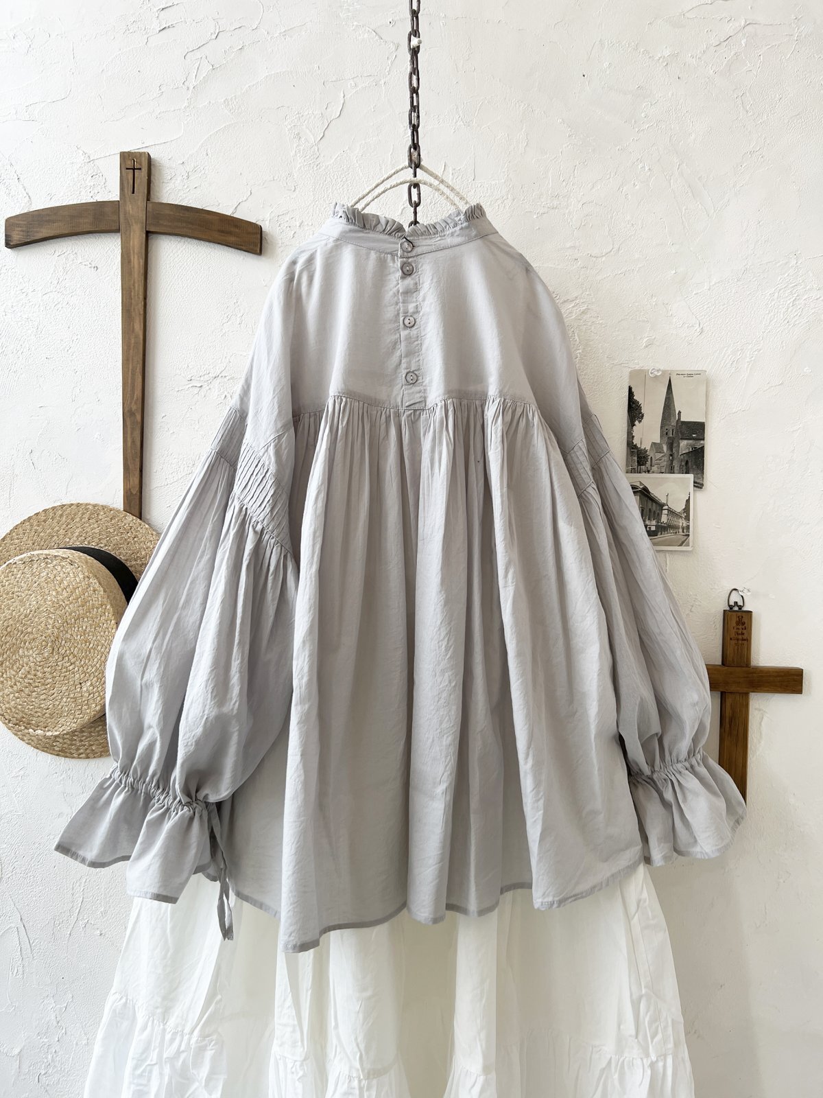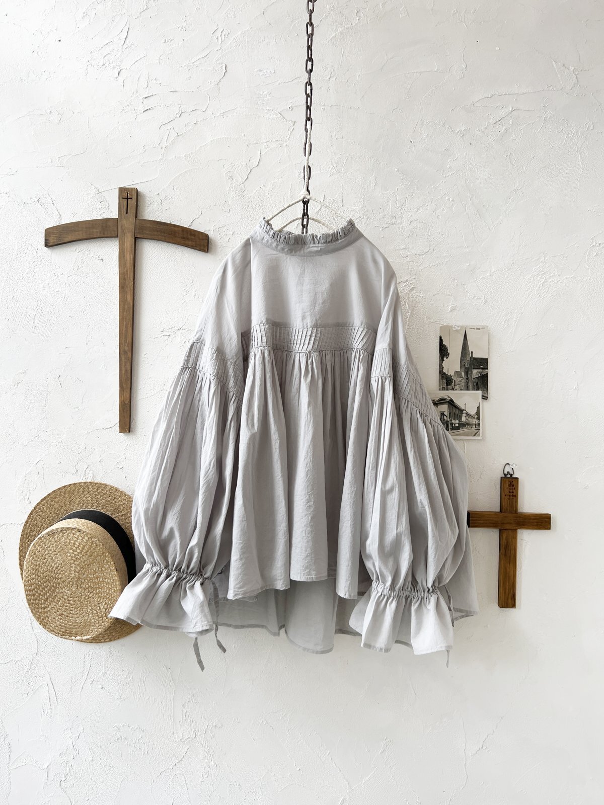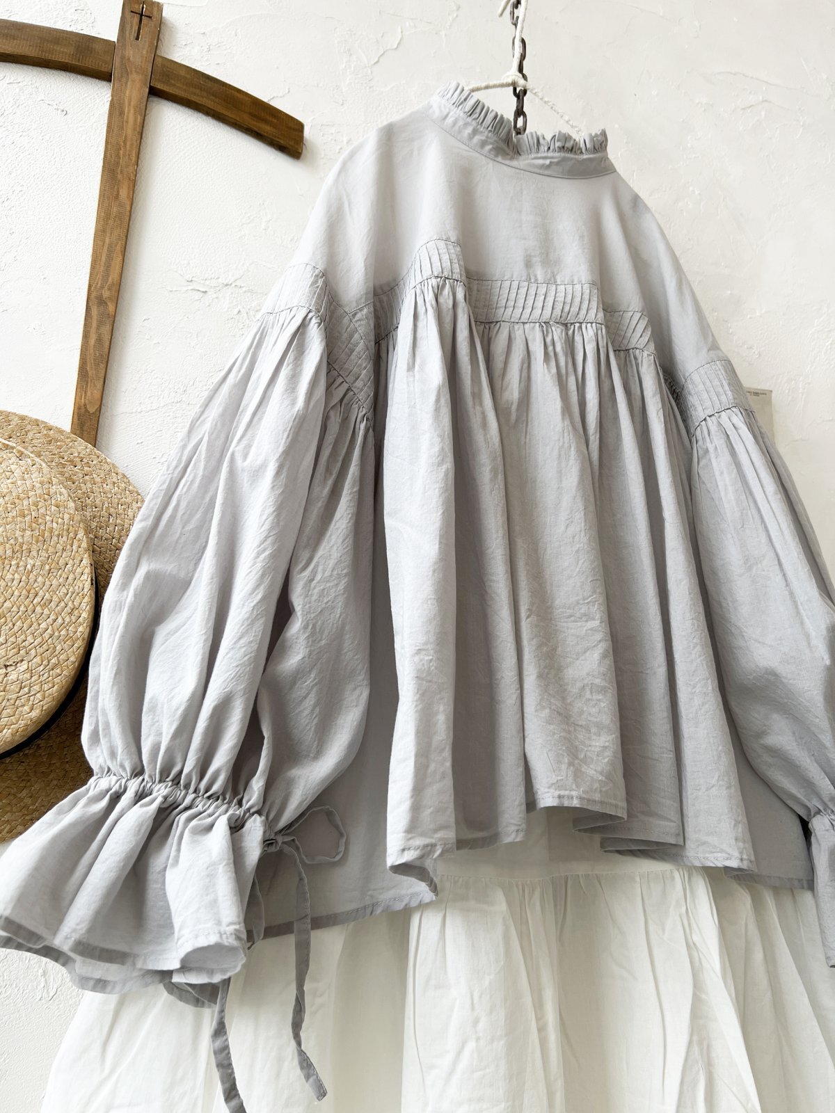 tegami/ピンタックリボンパフ袖のブラウス・ライトグレー [OTH250428]