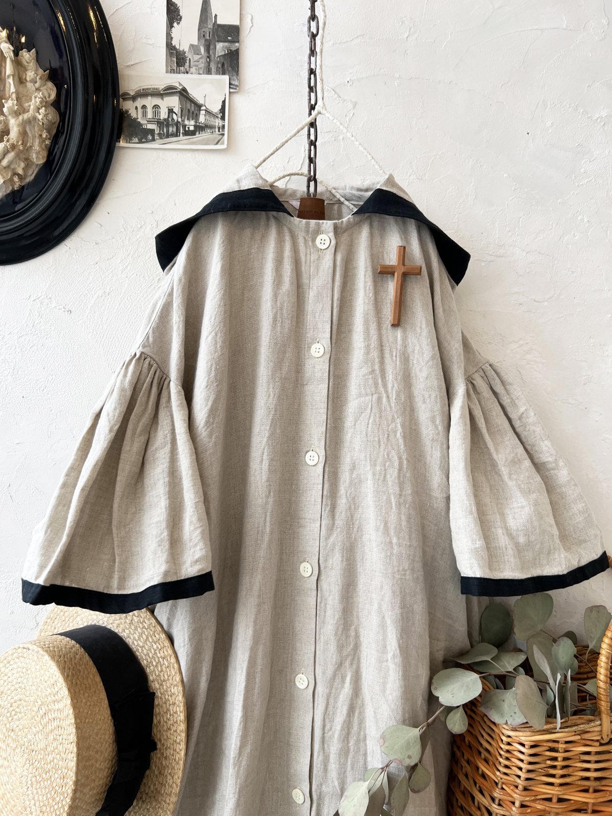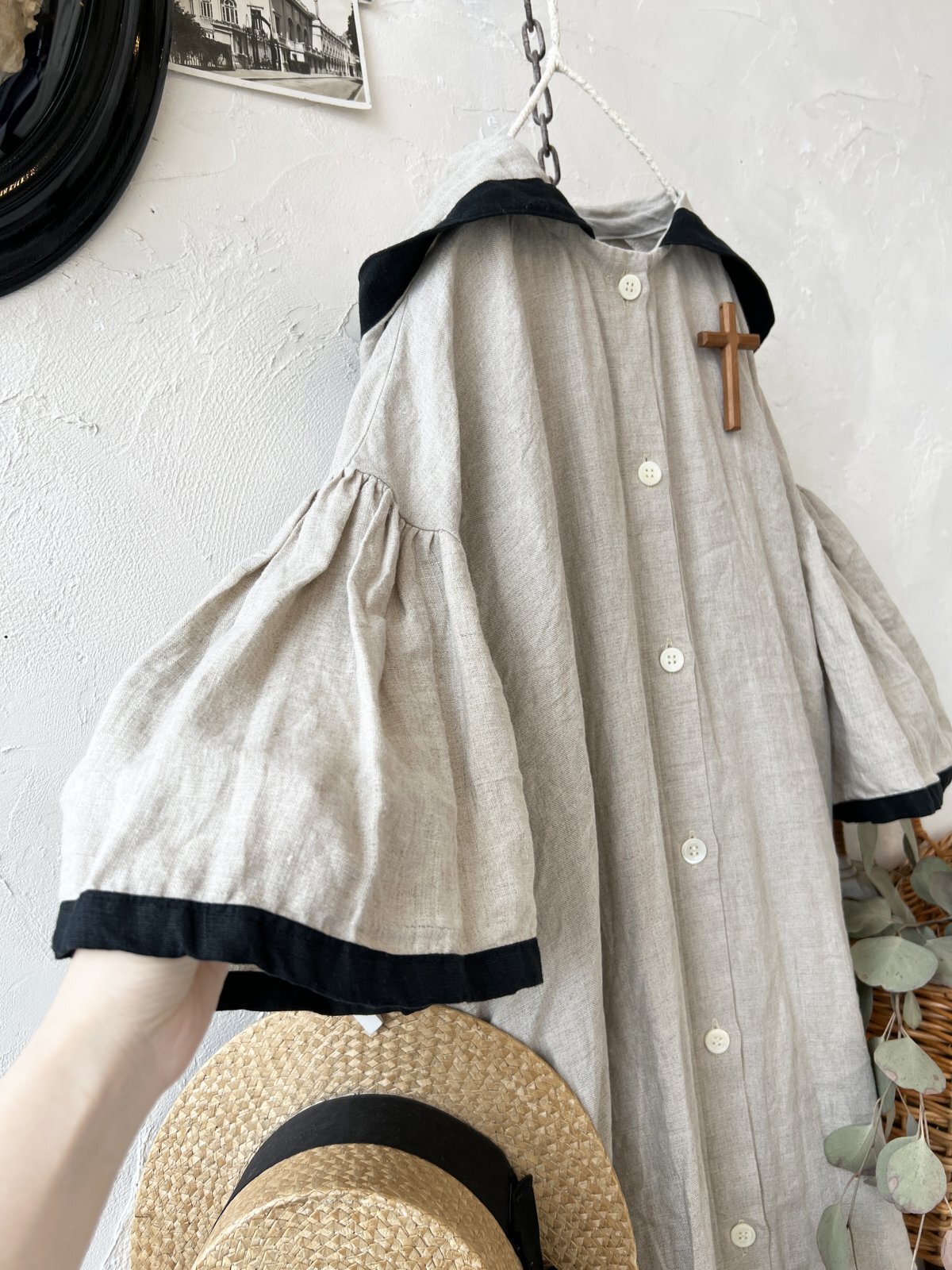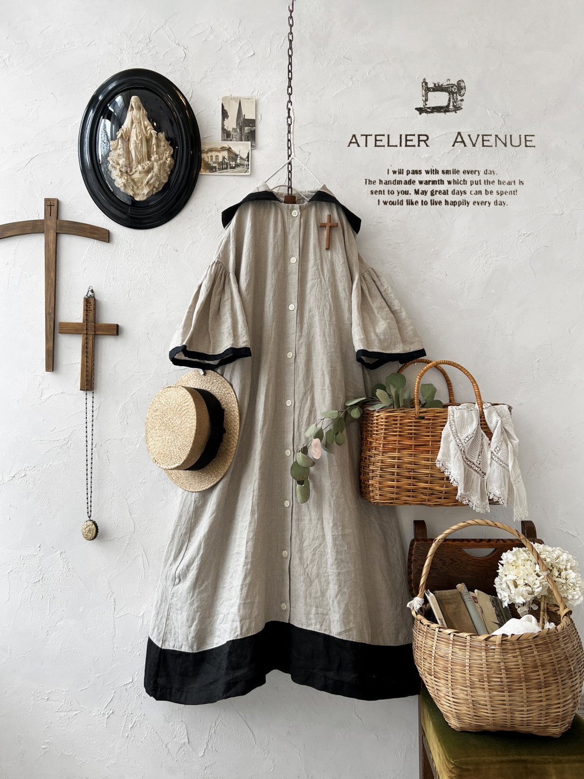 Avenue/フード付きリネンワンピース・生成りに黒ライン [AVE250601]