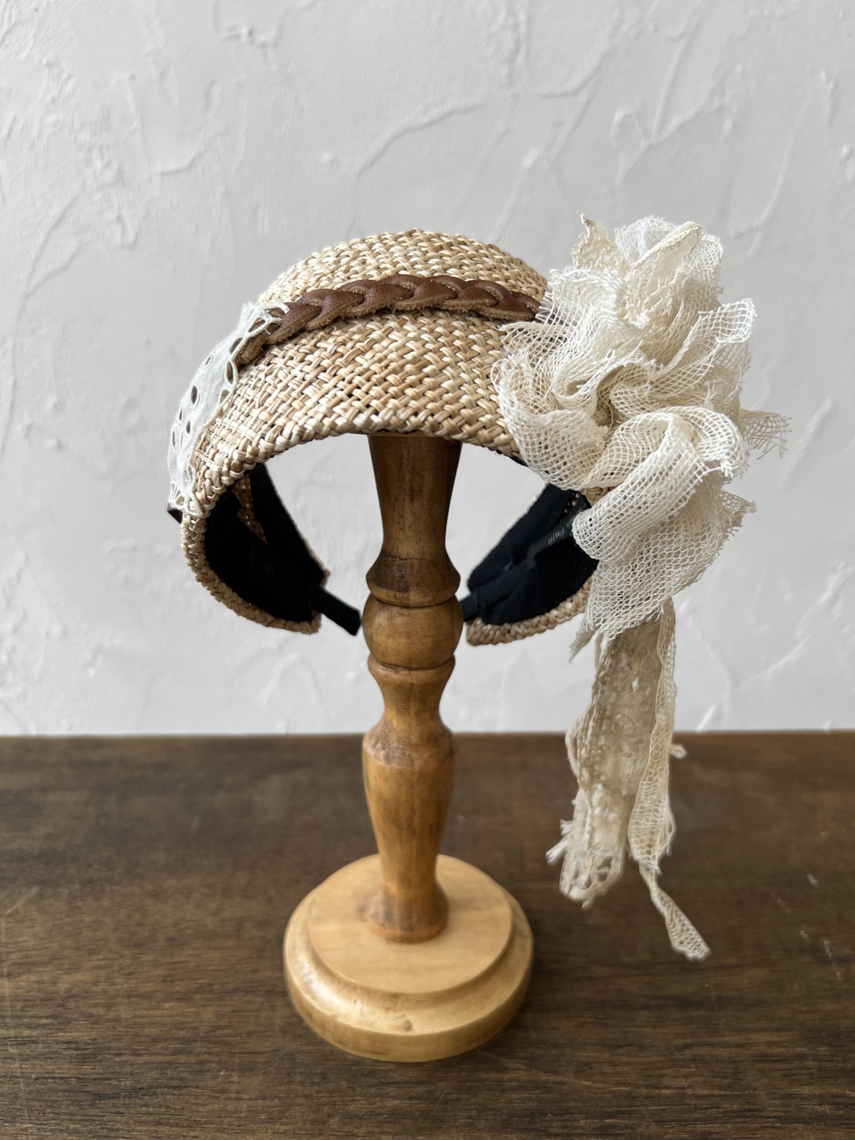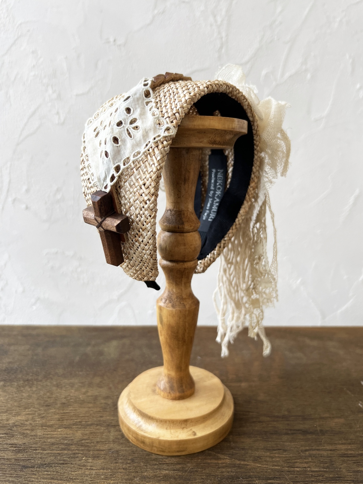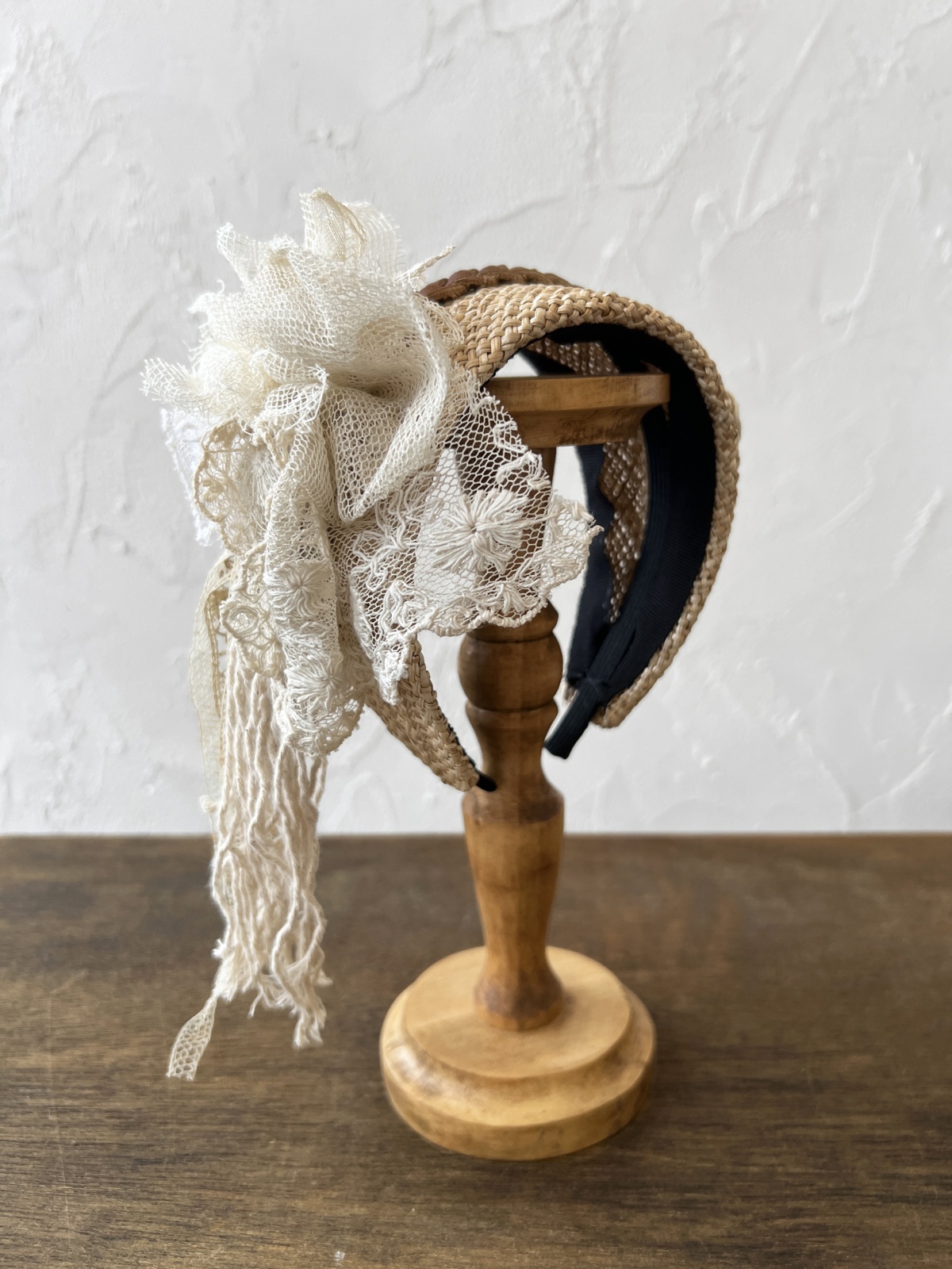 幹の皮を加工した天然素材で作った幅広のカチューシャです。