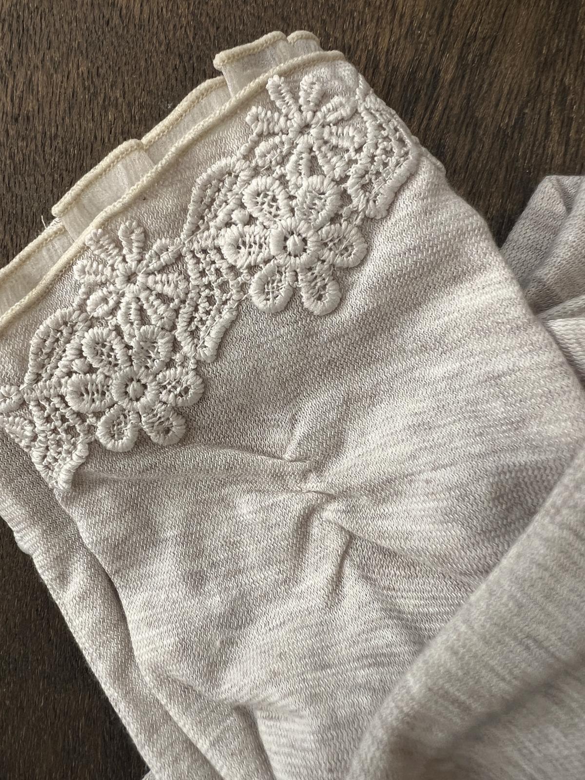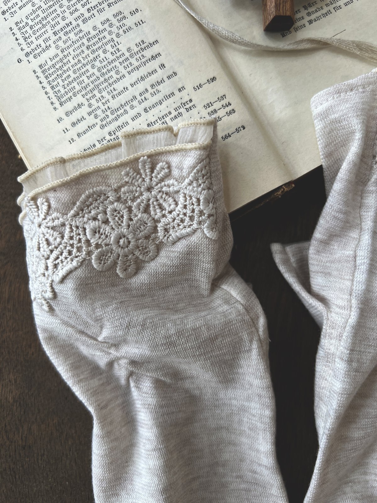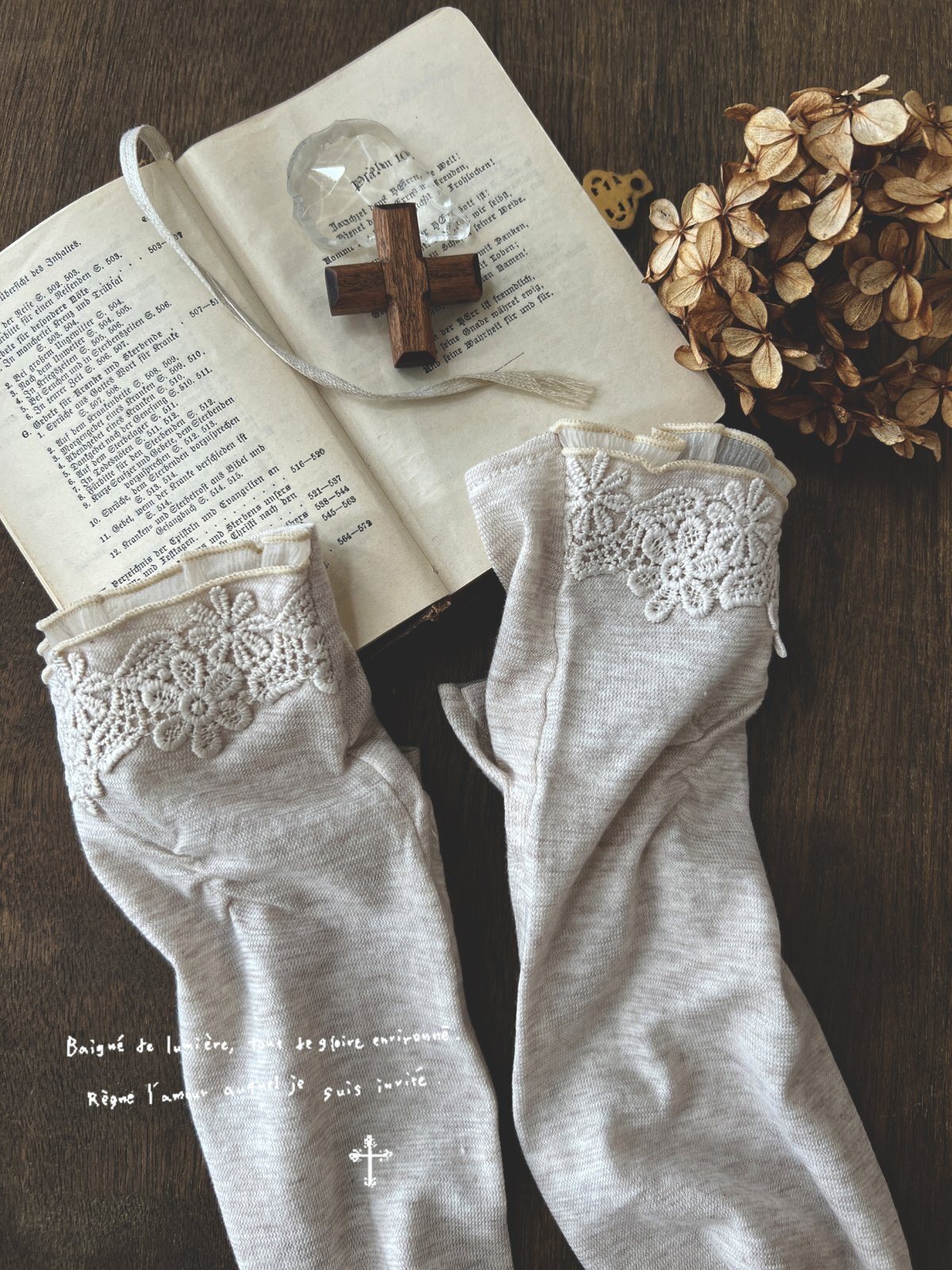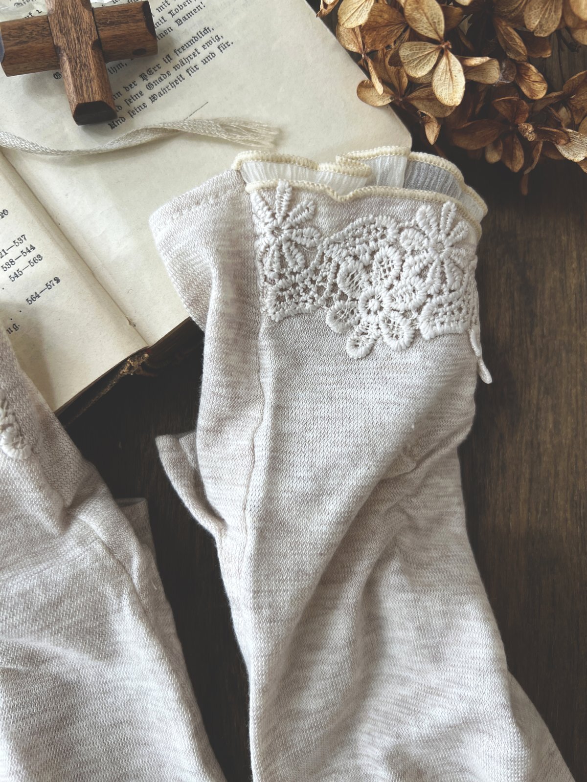 同色のレースと指先のオーガンジーフリルが