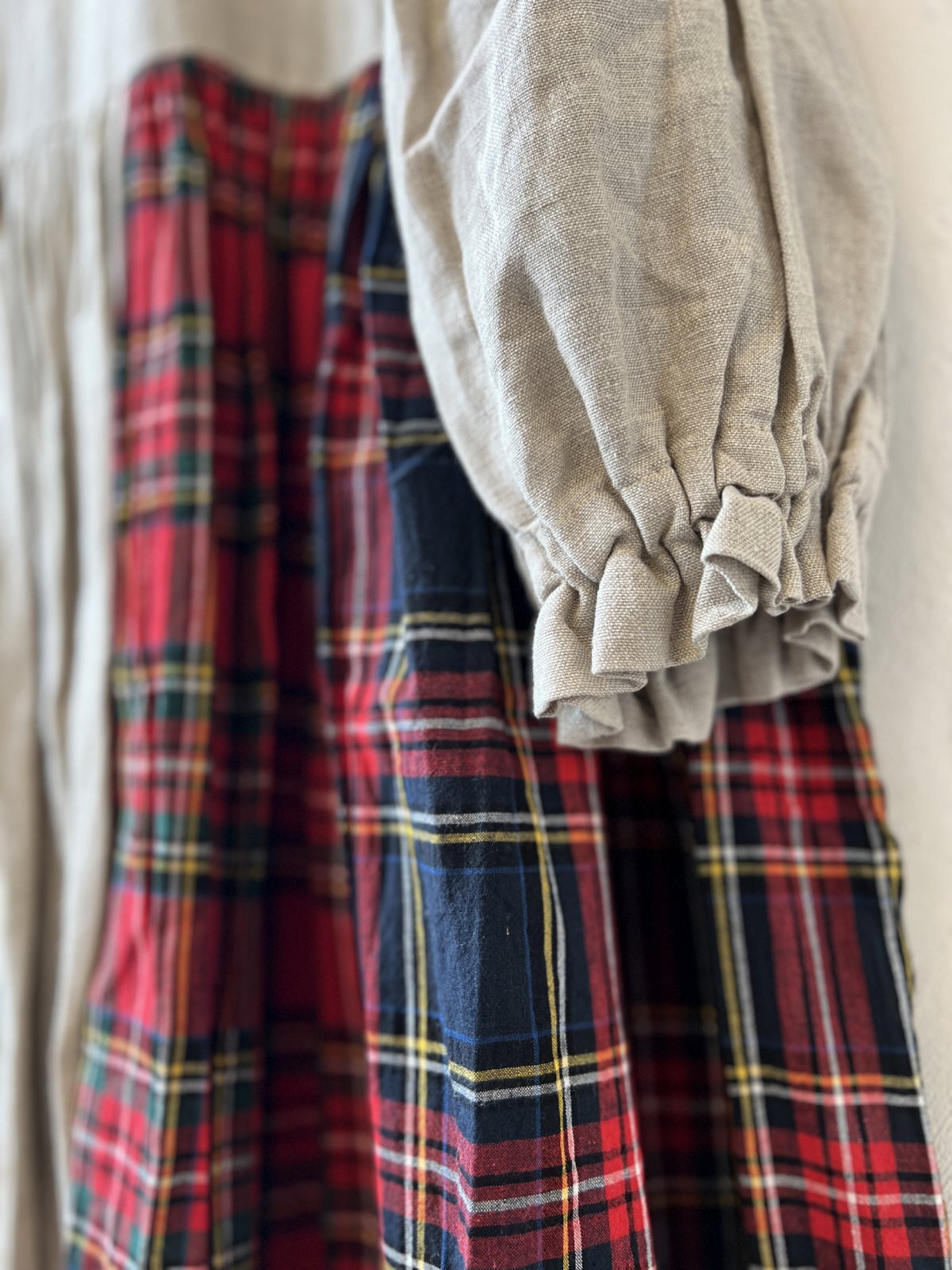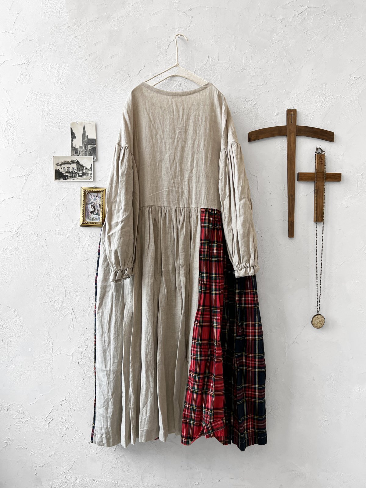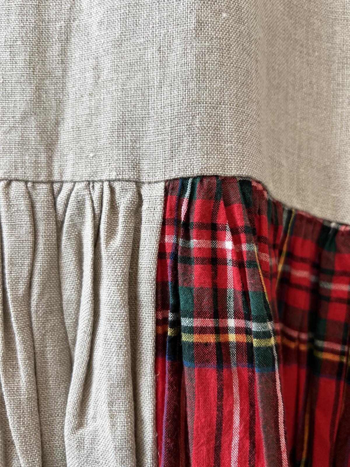 Avenue/赤チェック切り替えギャザーワンピース・生成り [AVE250903]