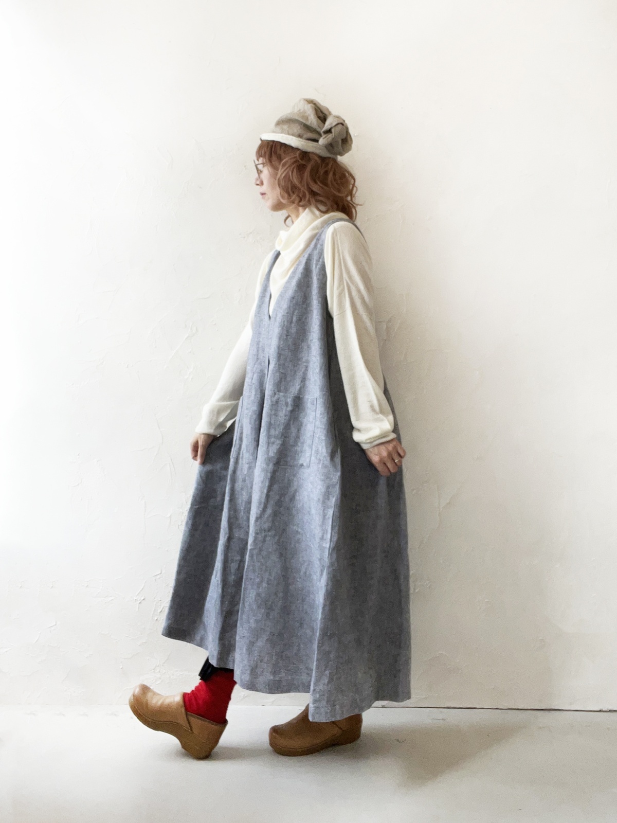 ブラウスやタートルネック、ニットの上に重ねて。