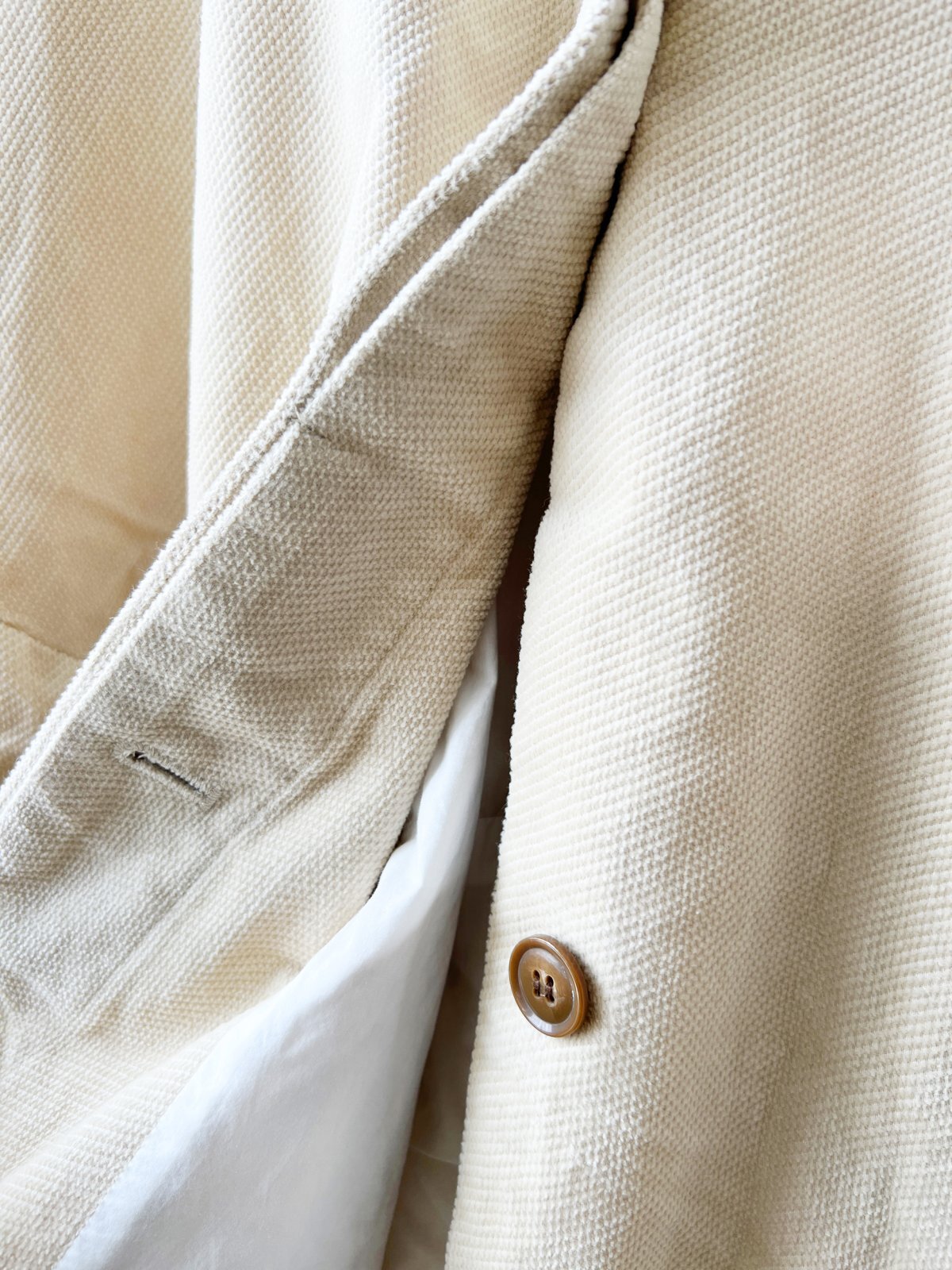 ボタンは隠れた比翼デザインで、身頃の裏地はコットン、