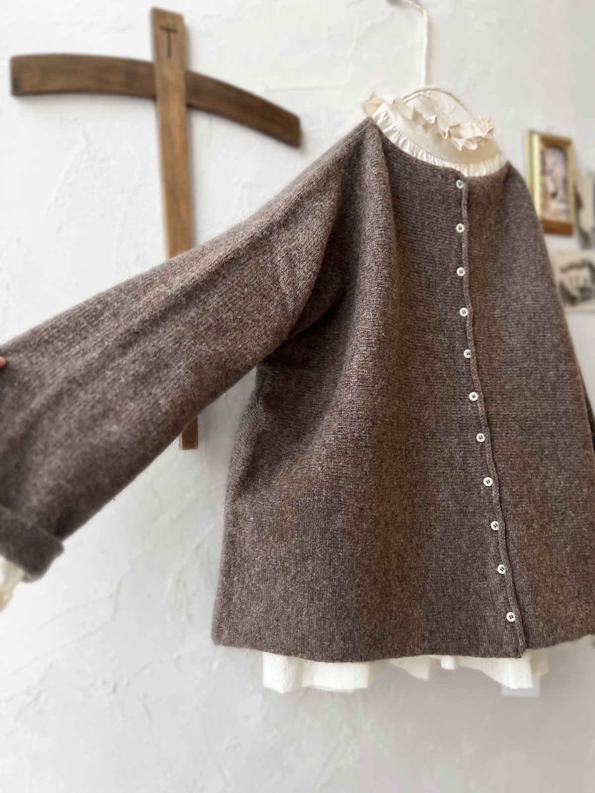 前後着用できるので、カーディガンとしても、後ろボタンの