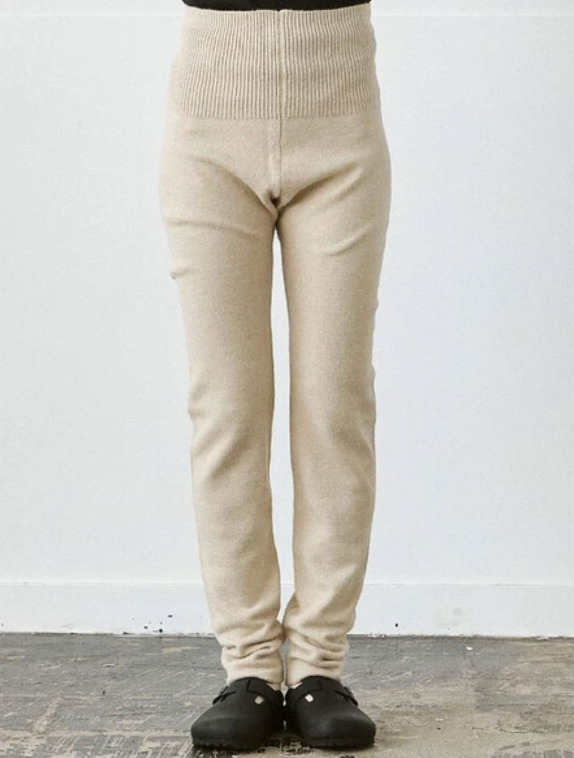おなかをすっぽり暖めてくれる肉厚のニットパンツ。
