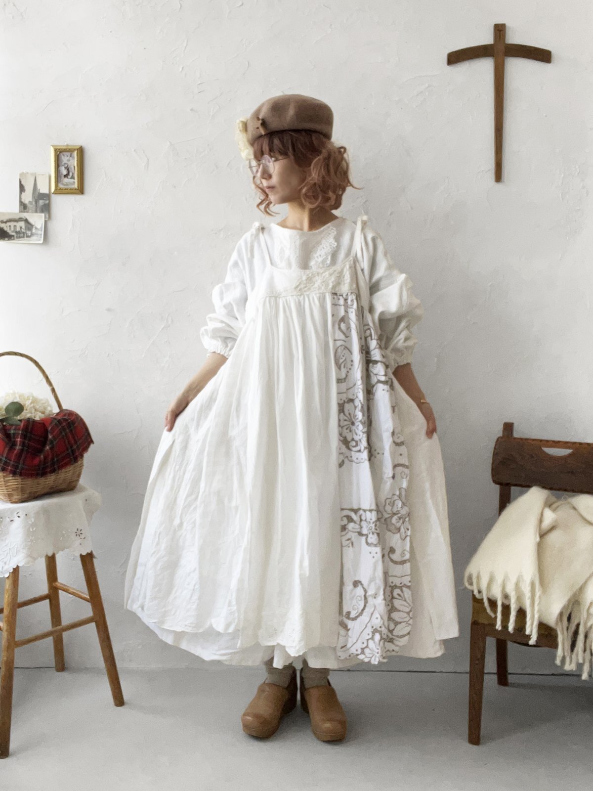 オフホワイトリネンに豪華なアンティークマディラ刺繍のレースが印象的。