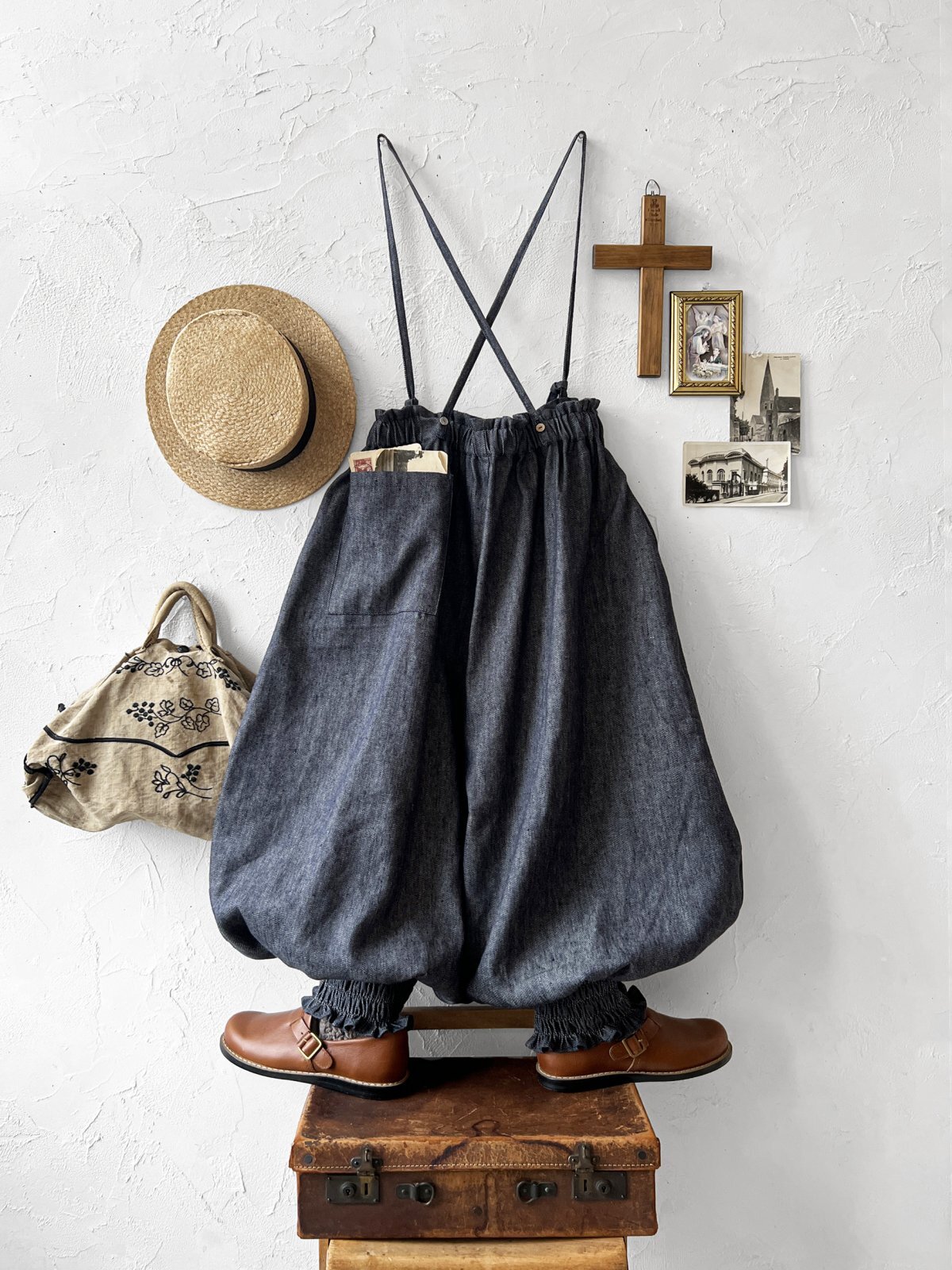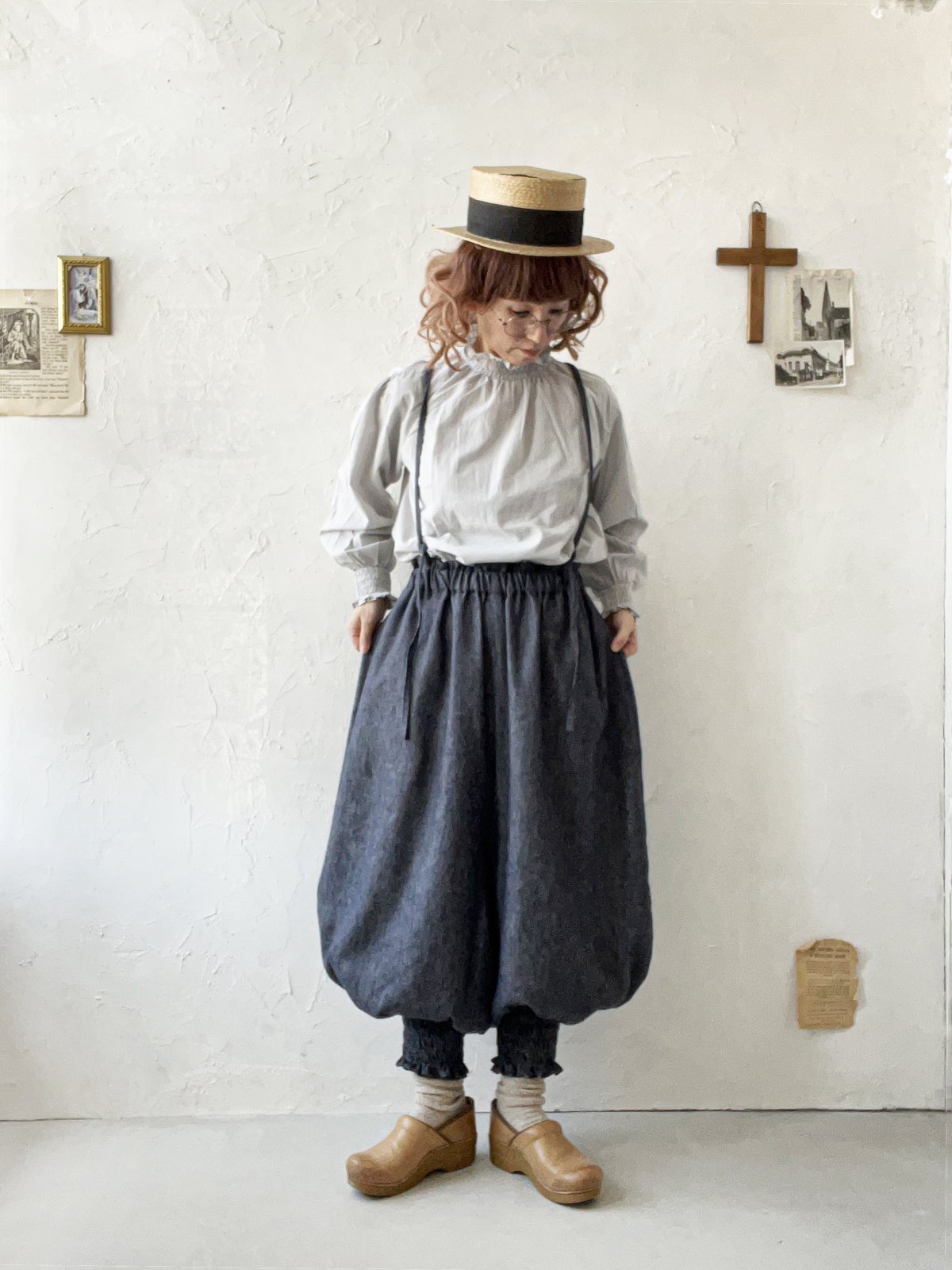 ぽわんと丸っこい形の、肩紐付きピエロパンツ。