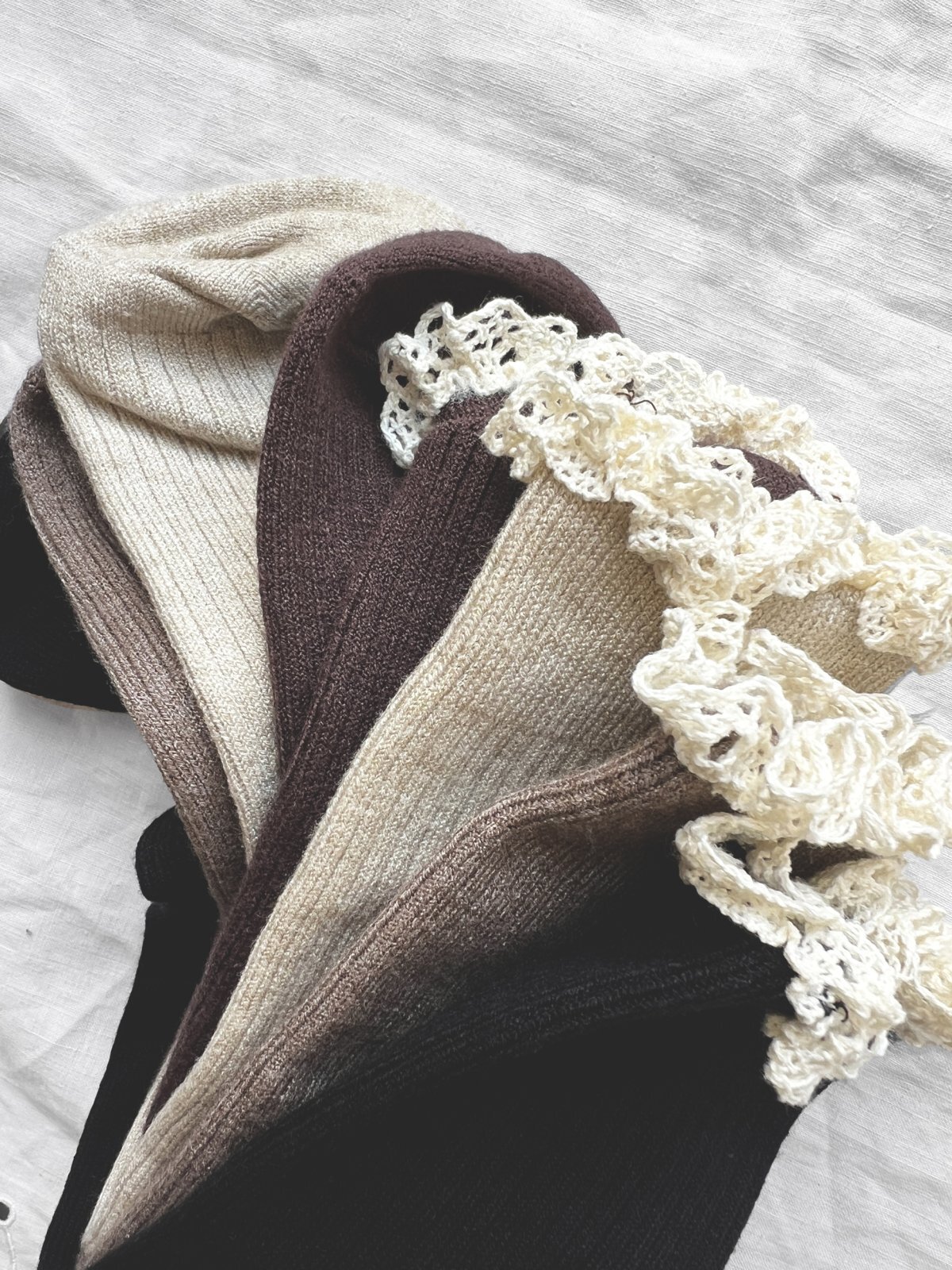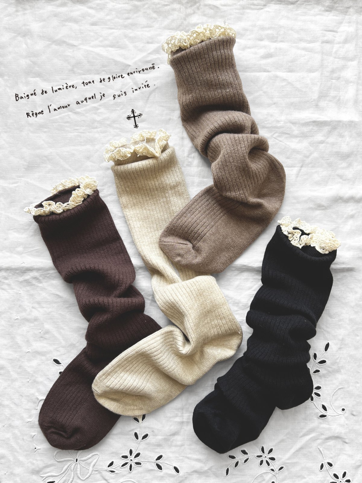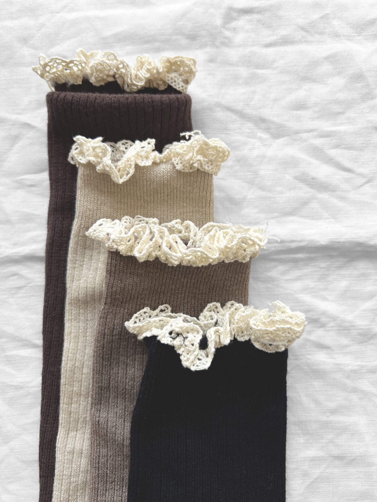 フリルレースが可愛らしい、膝下までの長め丈ソックスです。