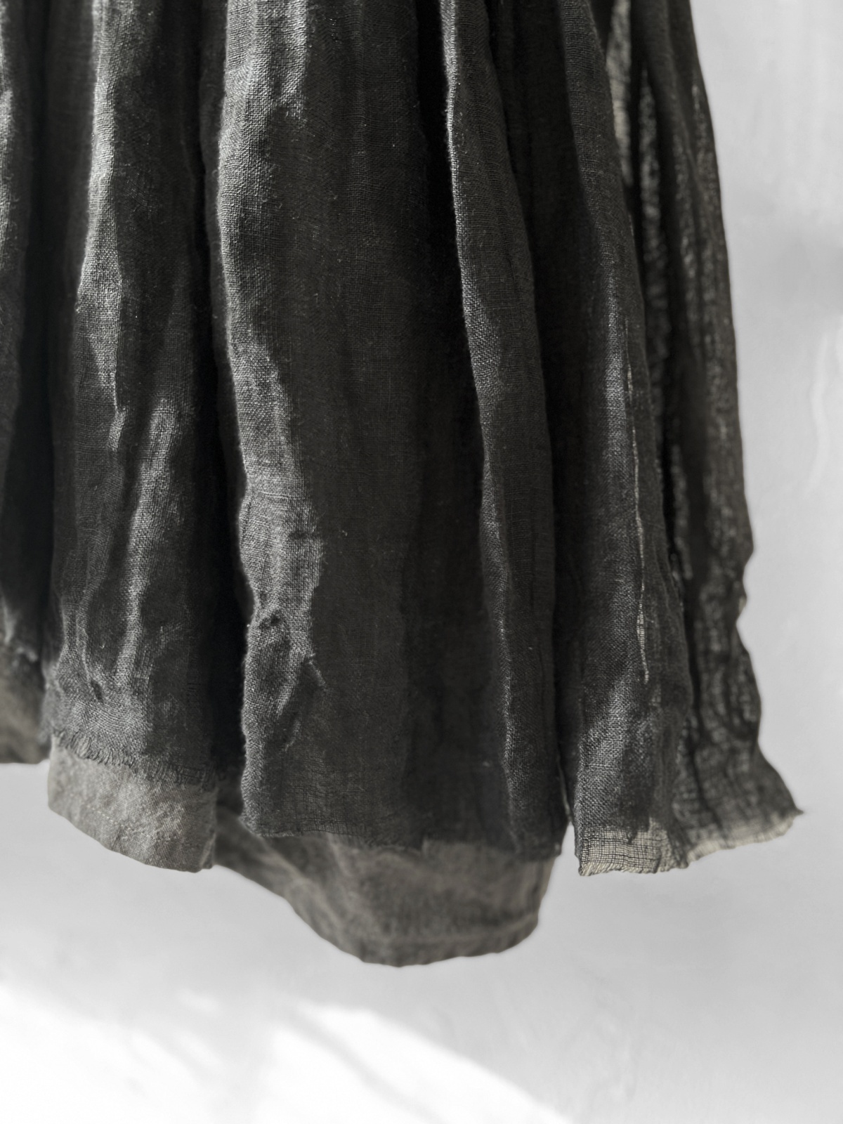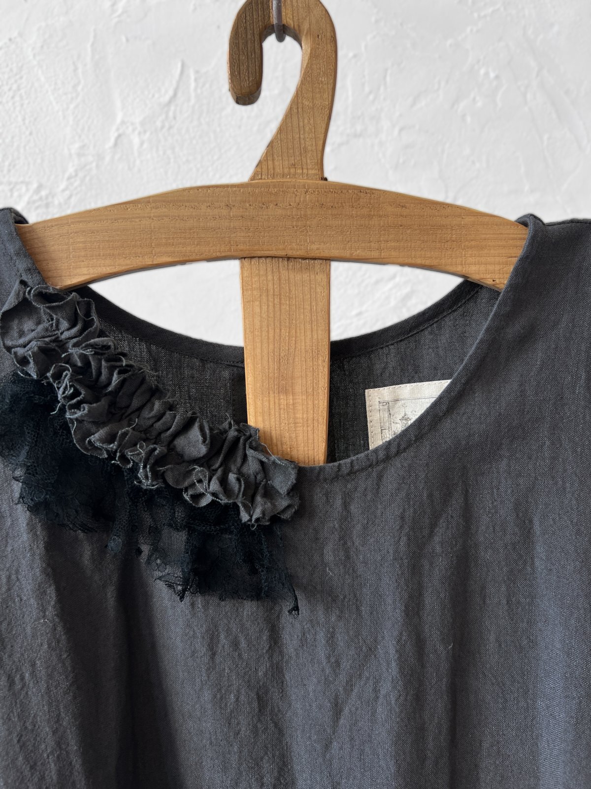 襟元には黒のアンティークレースを、裾にはリネンガーゼを
