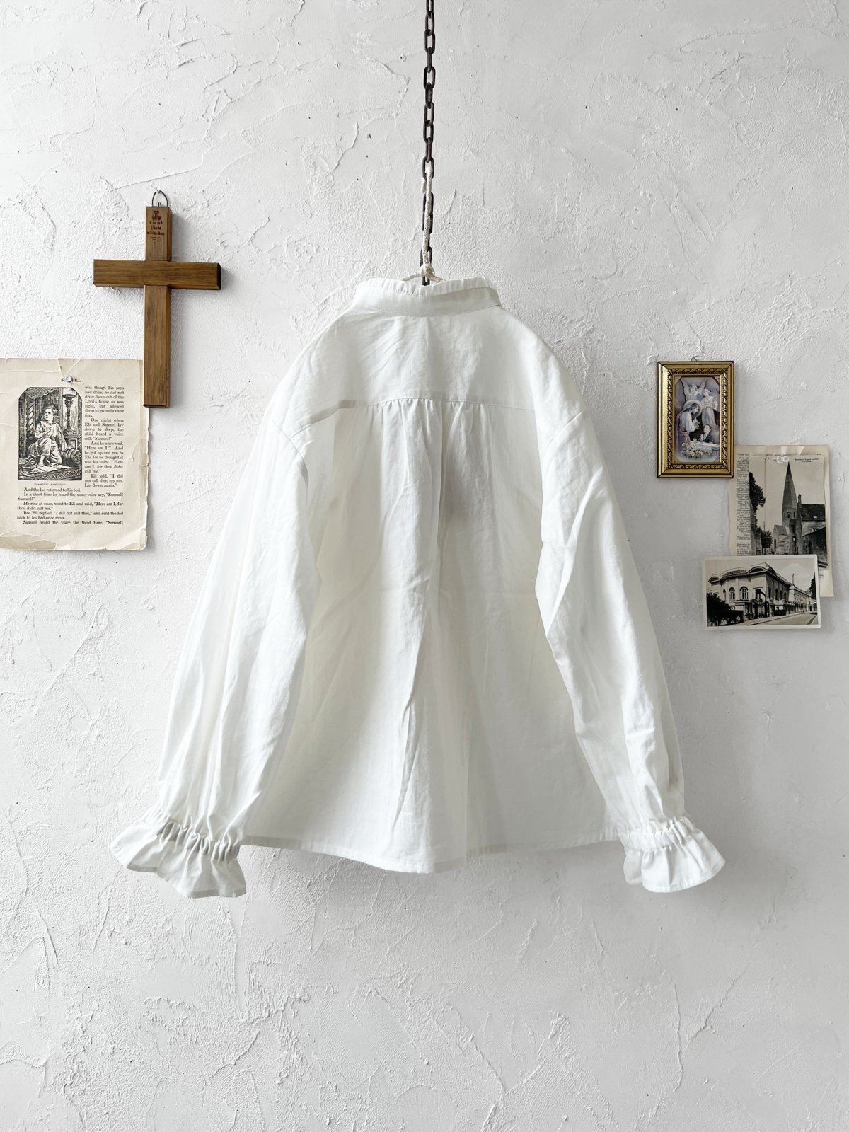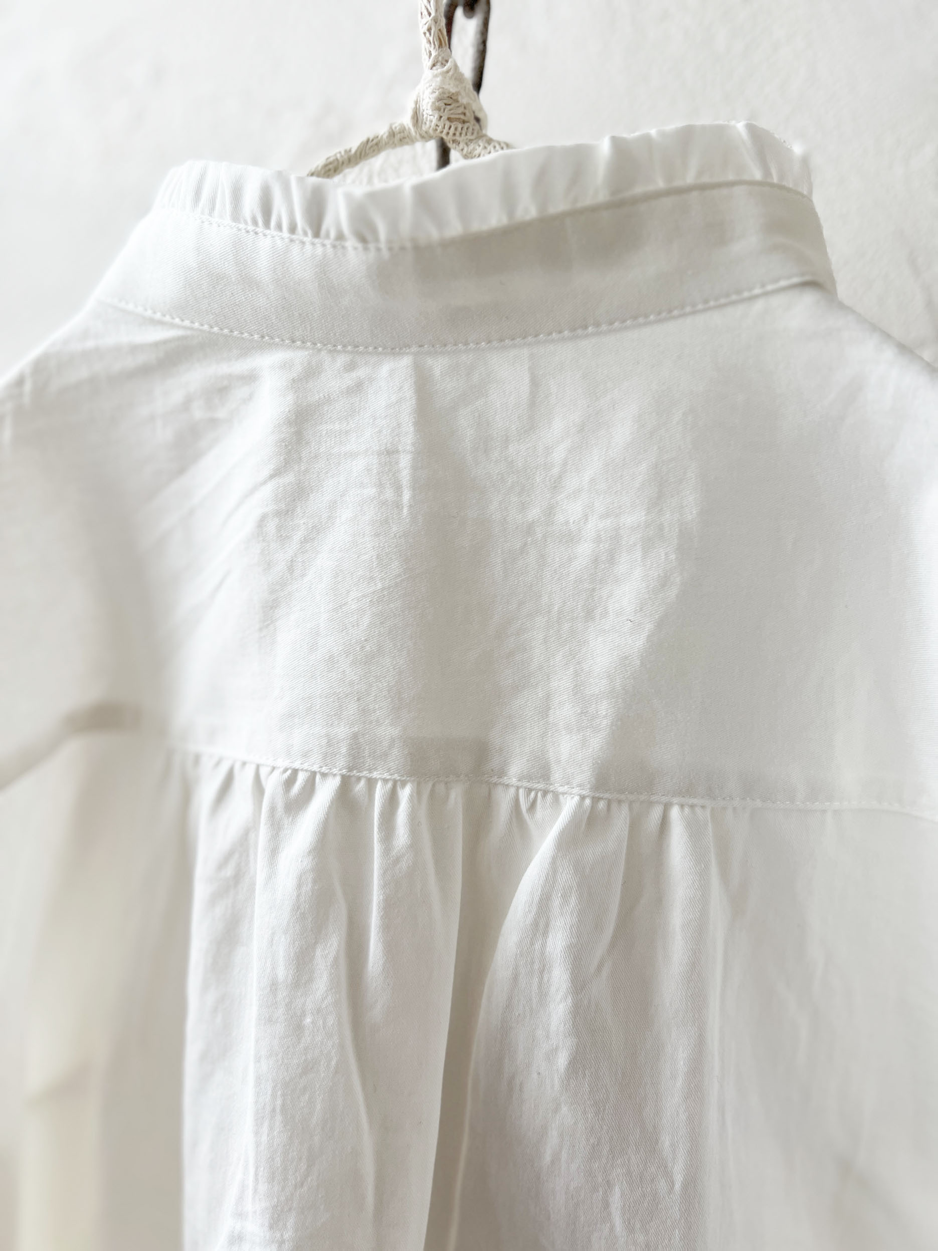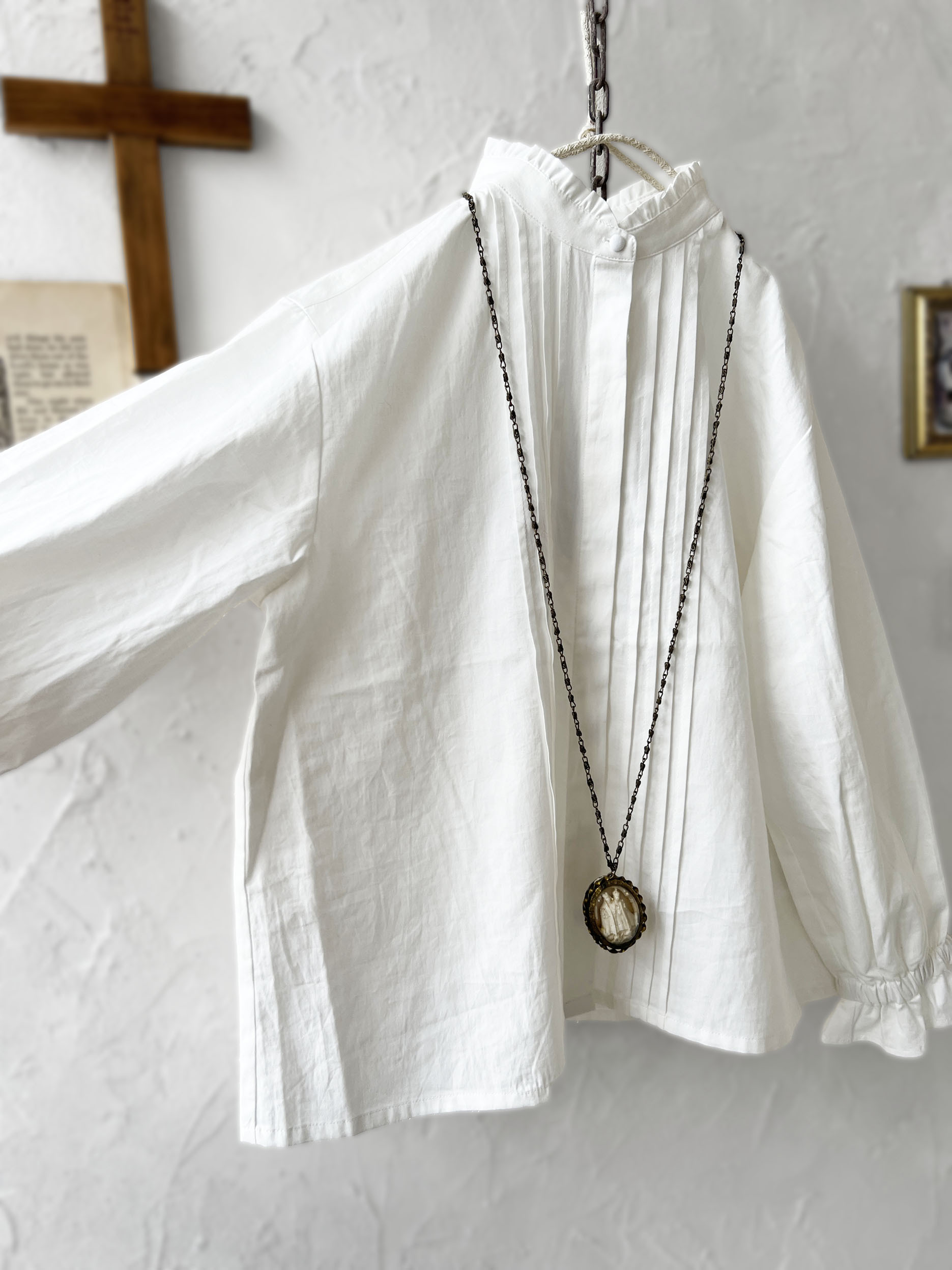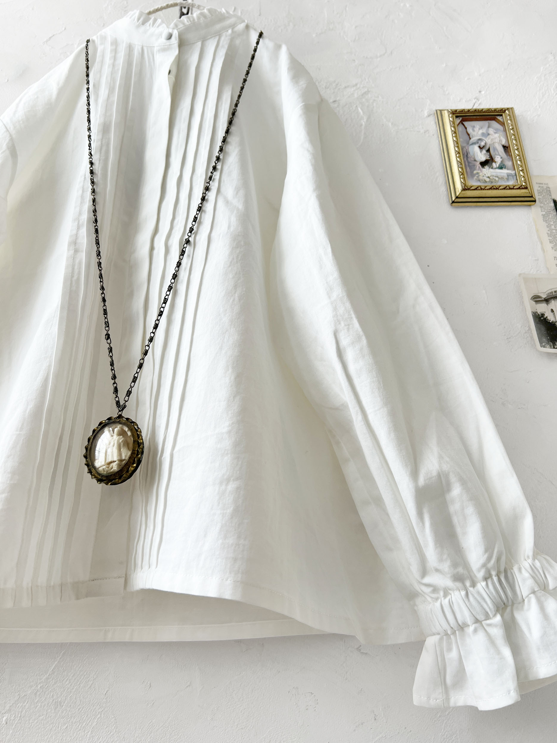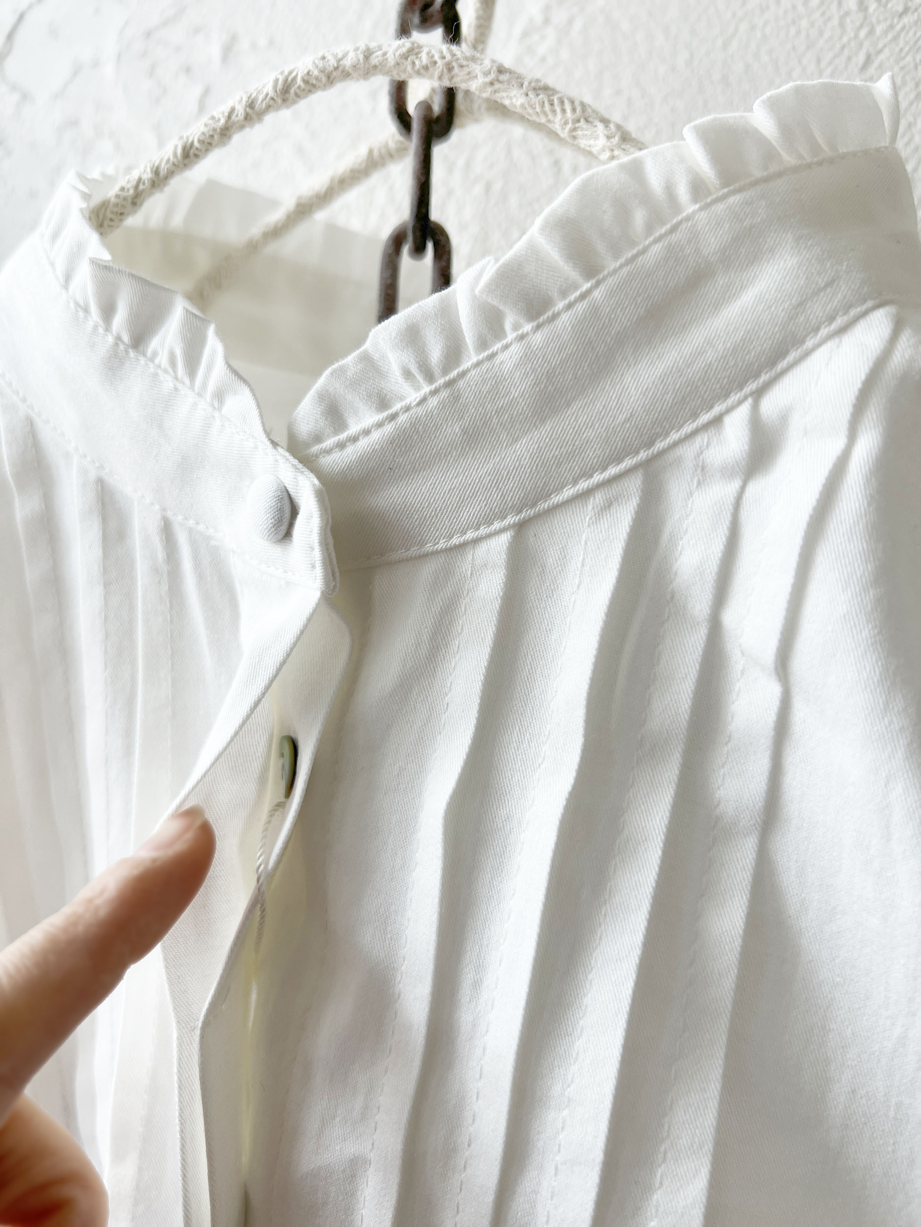 控えめな襟のフリルと、上品なピンタック。