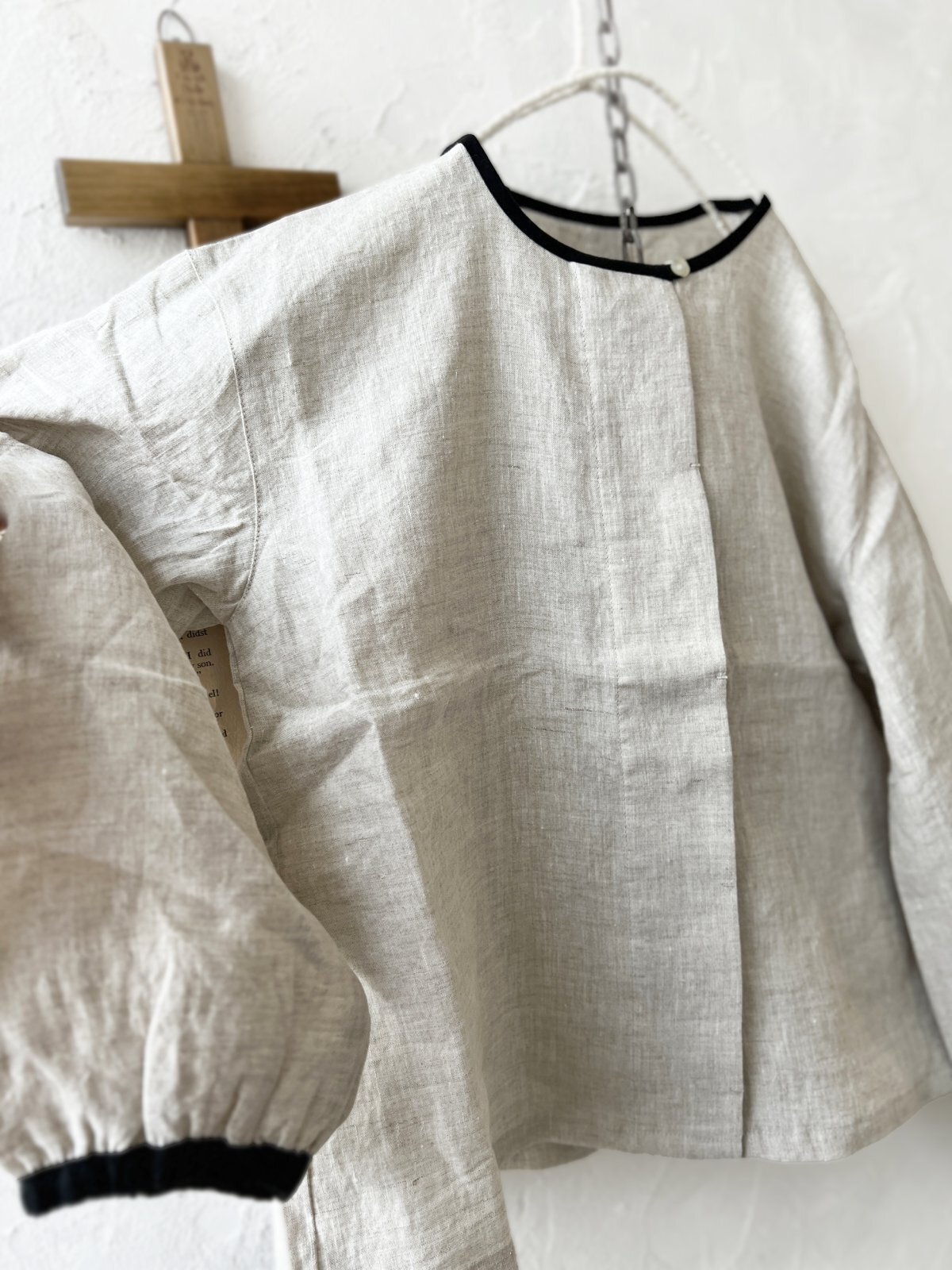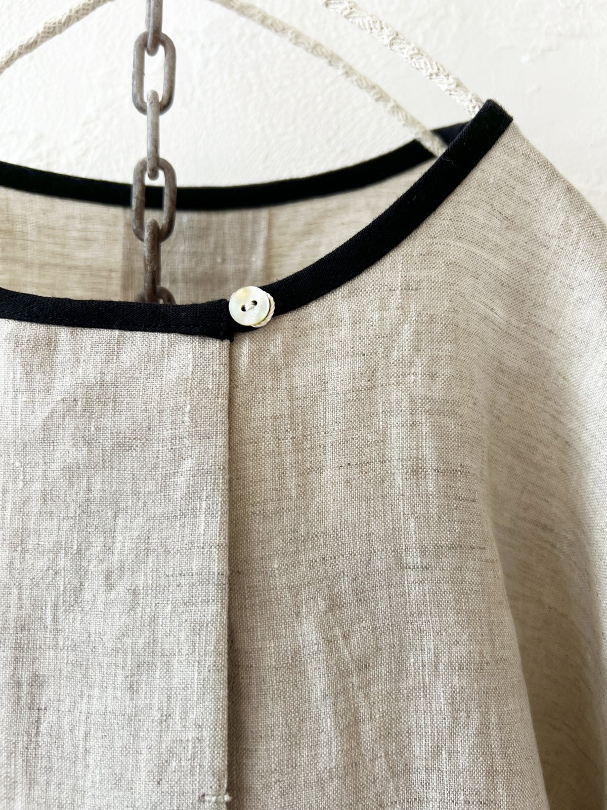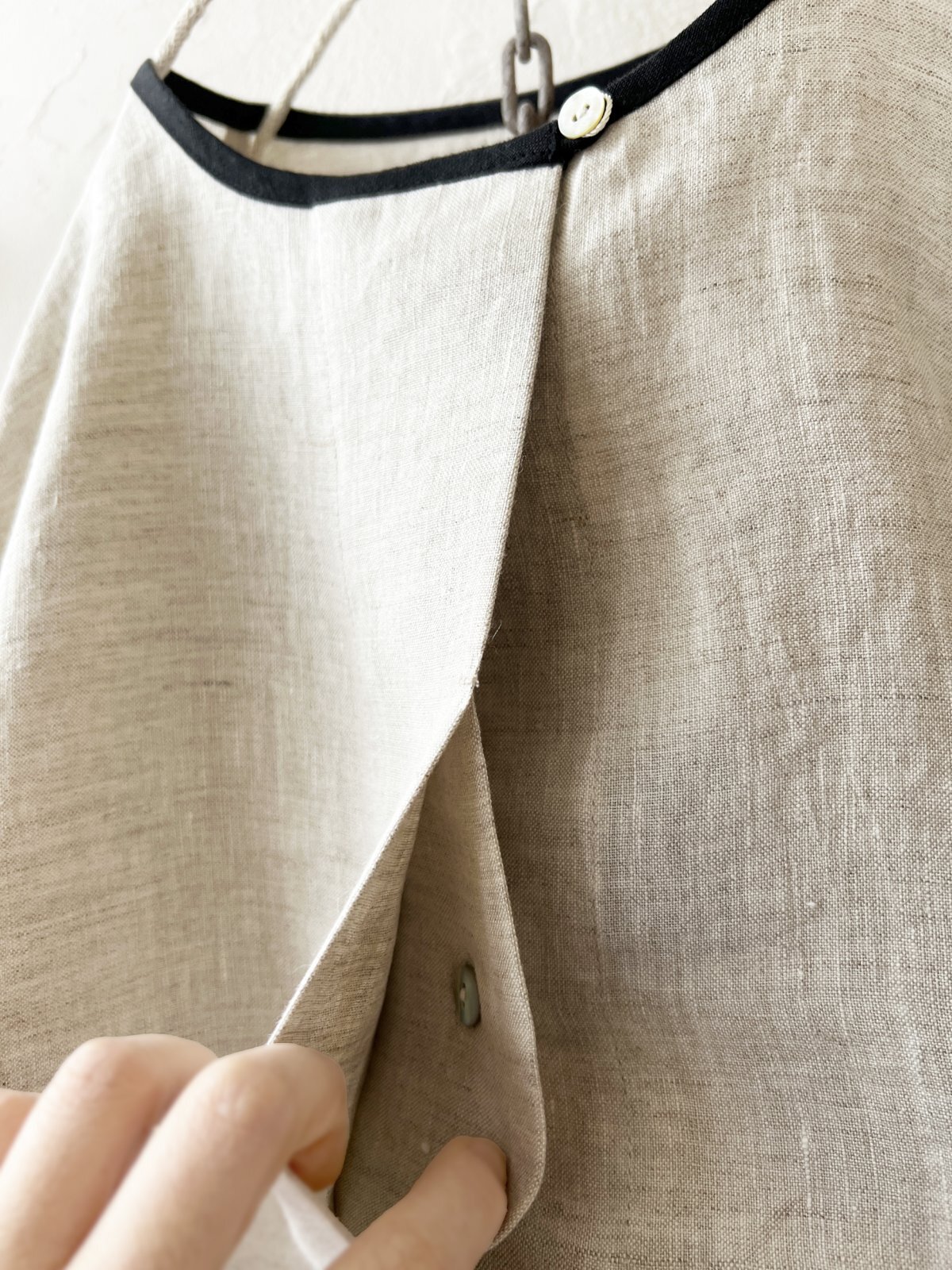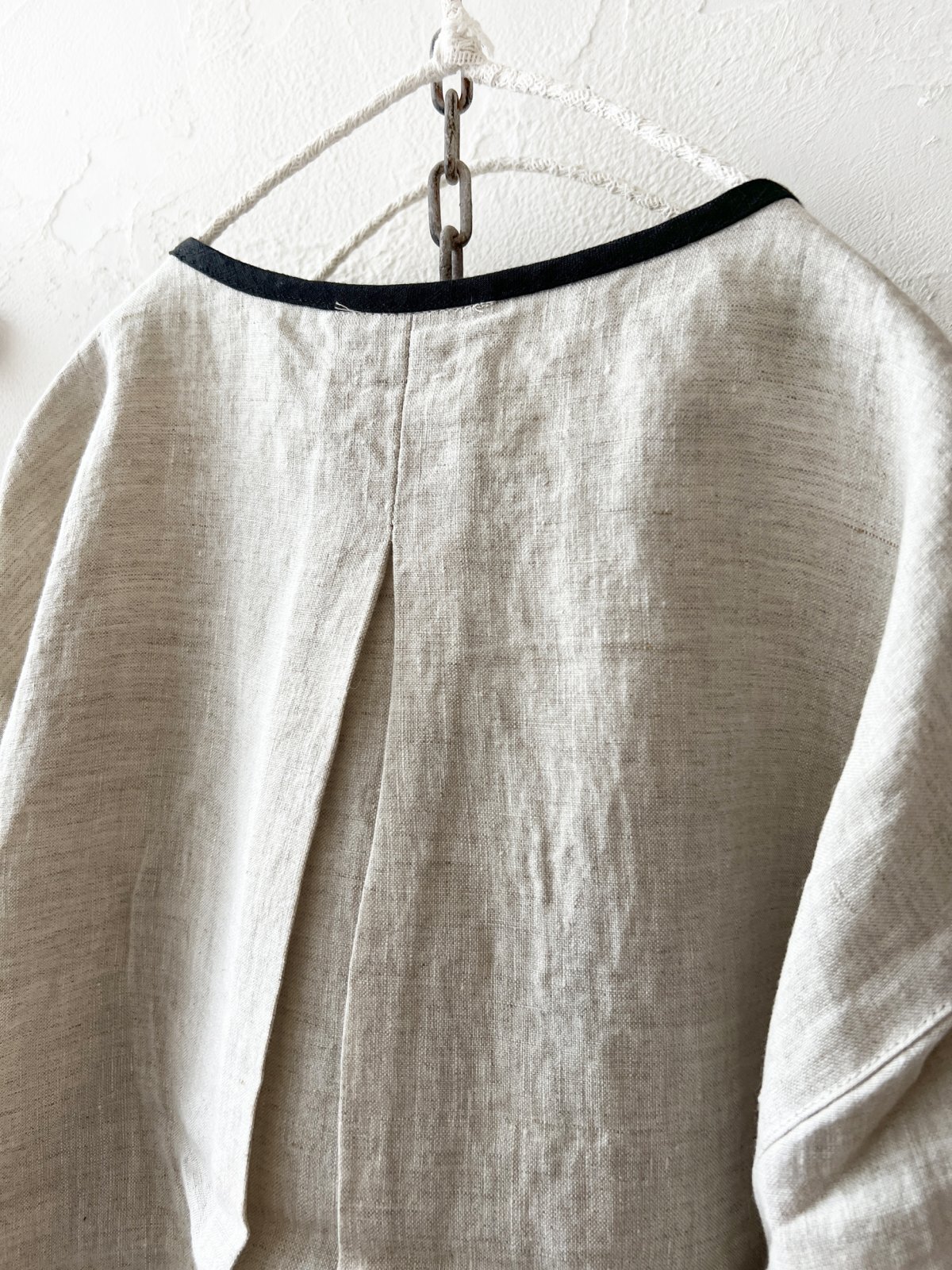 平織リネンのブラウスです。前開きで、ボタンは見えない
