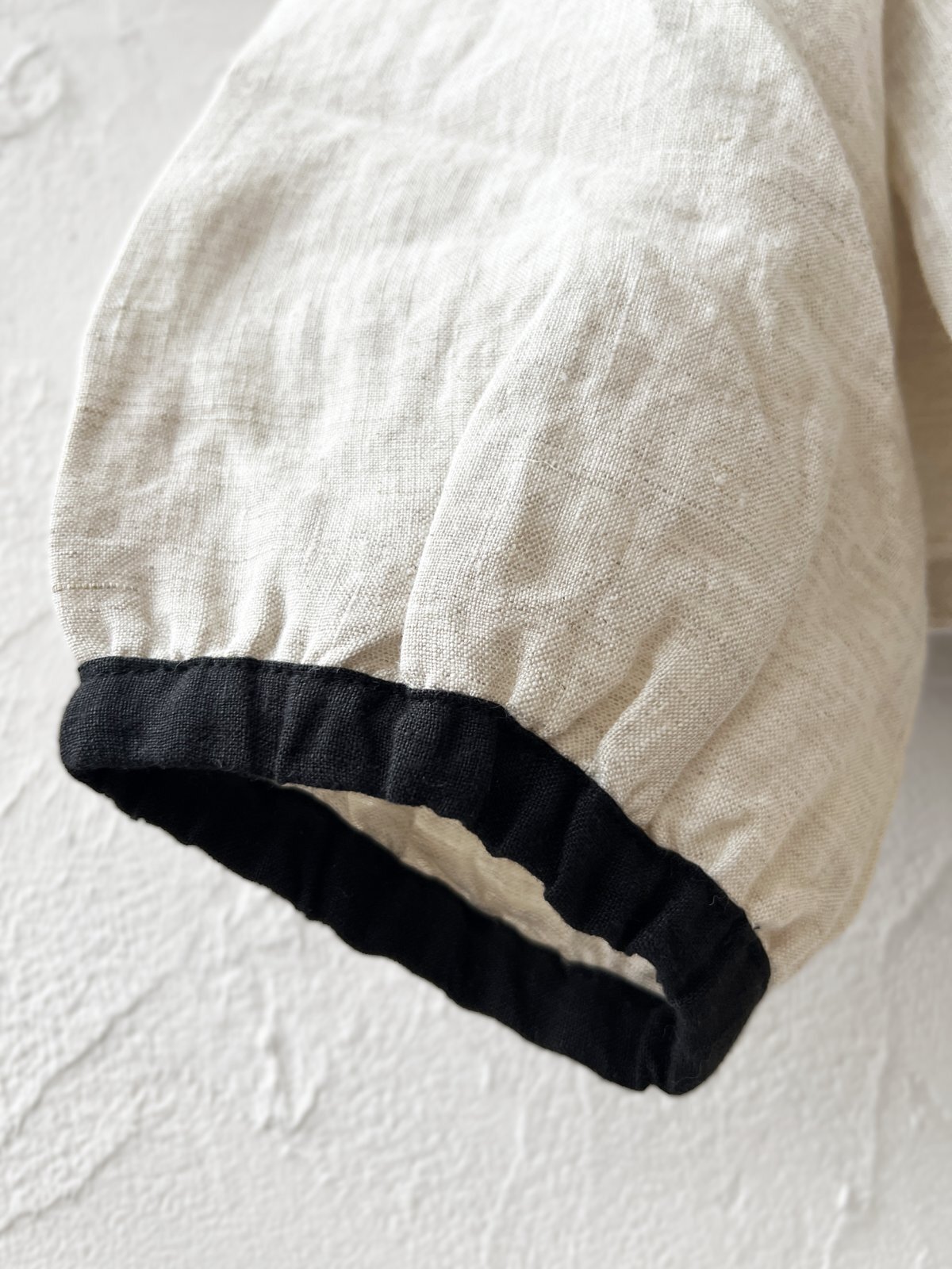 襟ぐりとお袖は黒のパイピングで配色に。