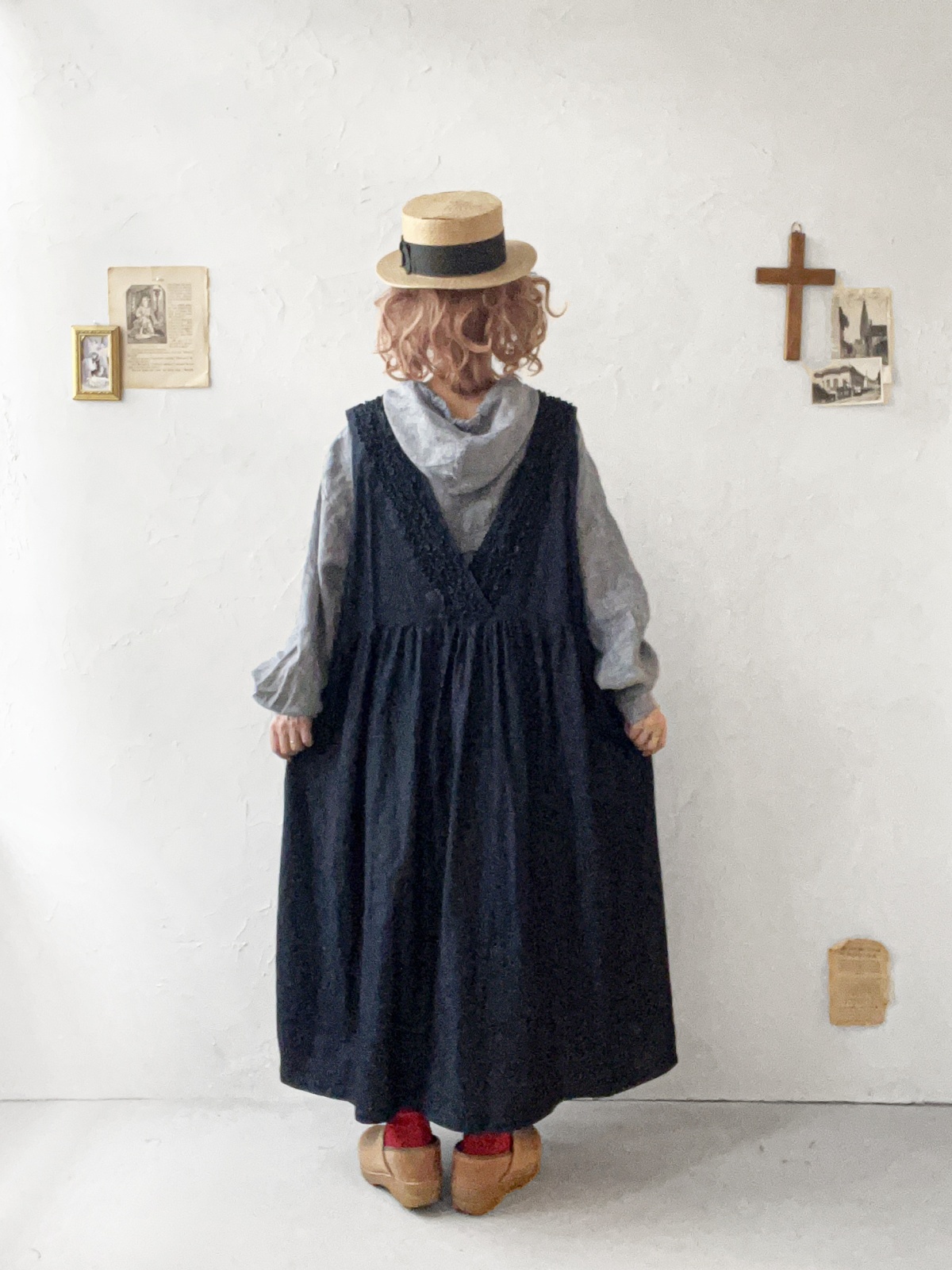 バックはクルーネック&ボタンにフリルたっぷりです。