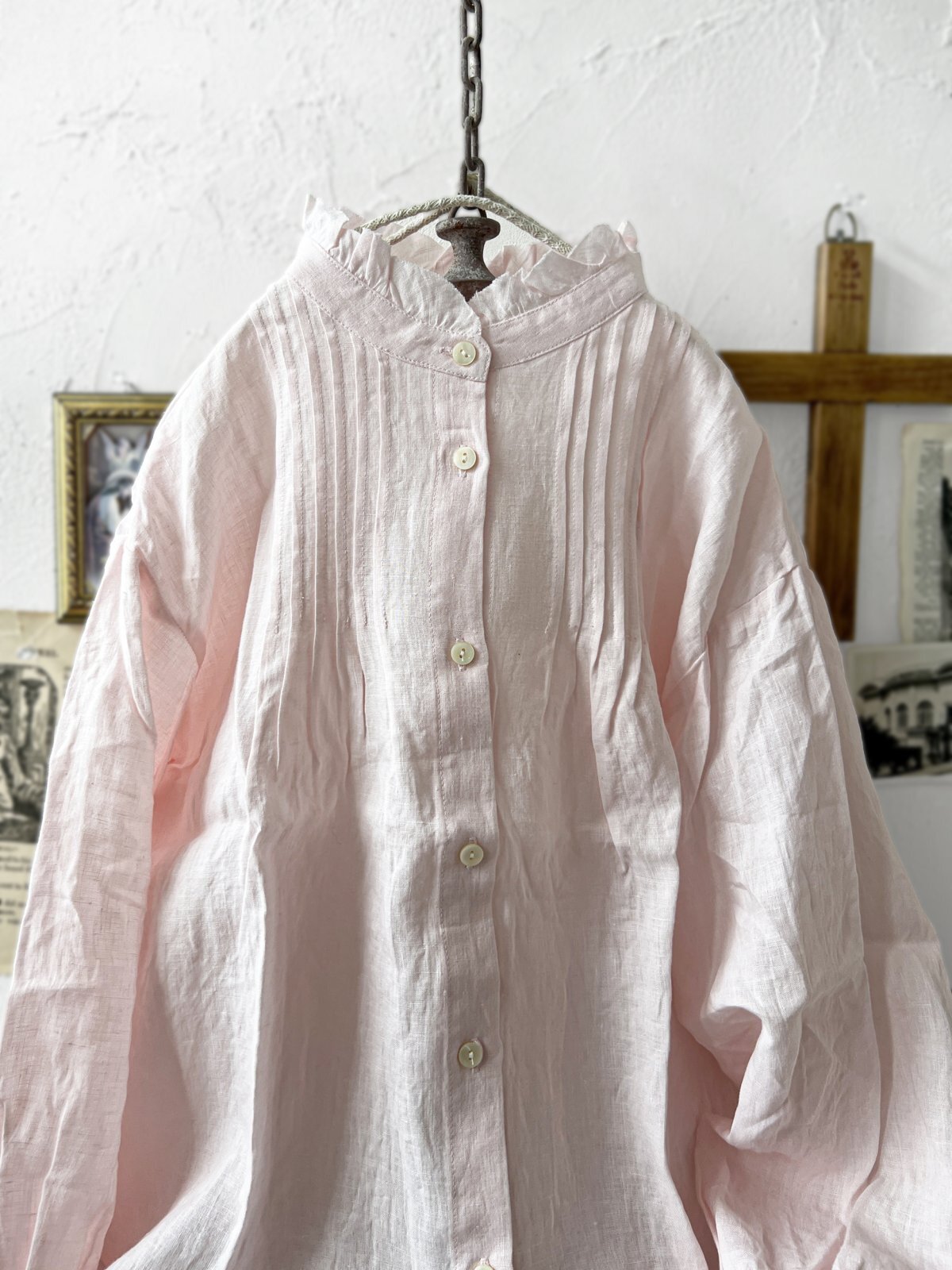 フリルの立ち襟に、細かなピンタックが素敵な