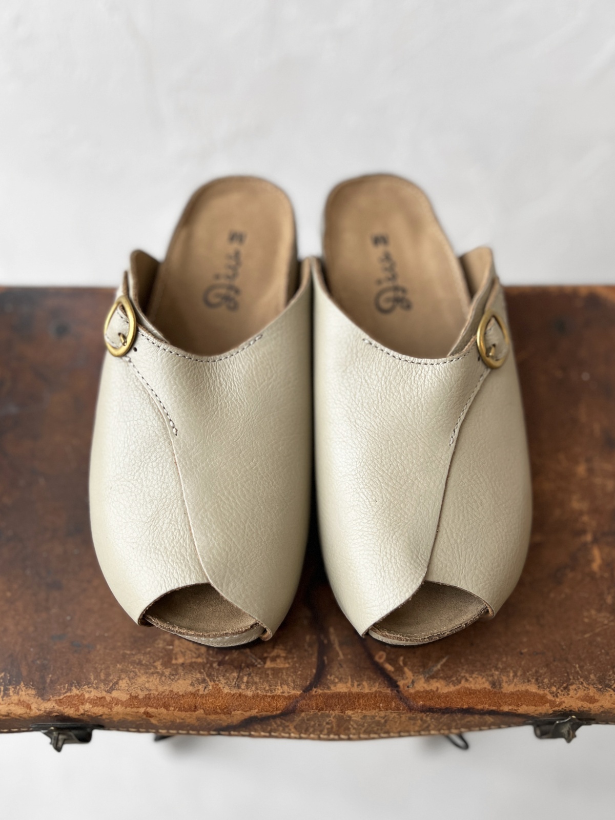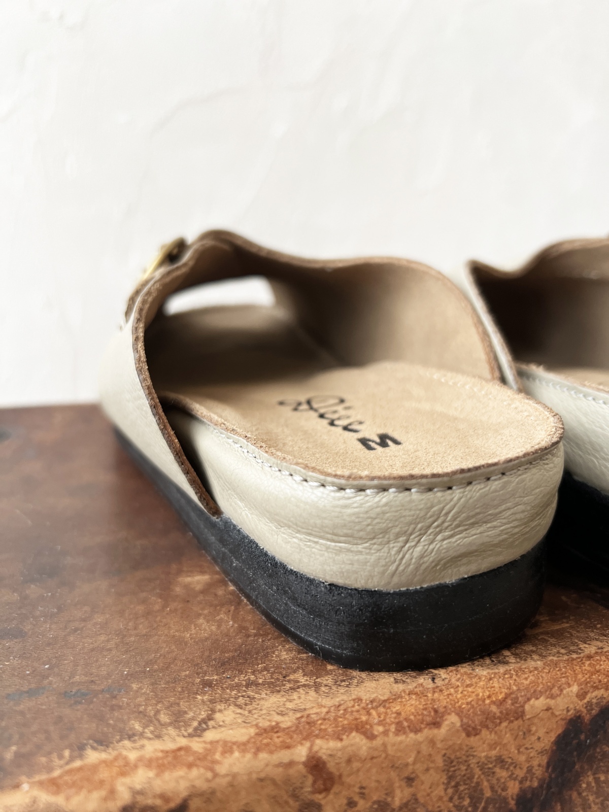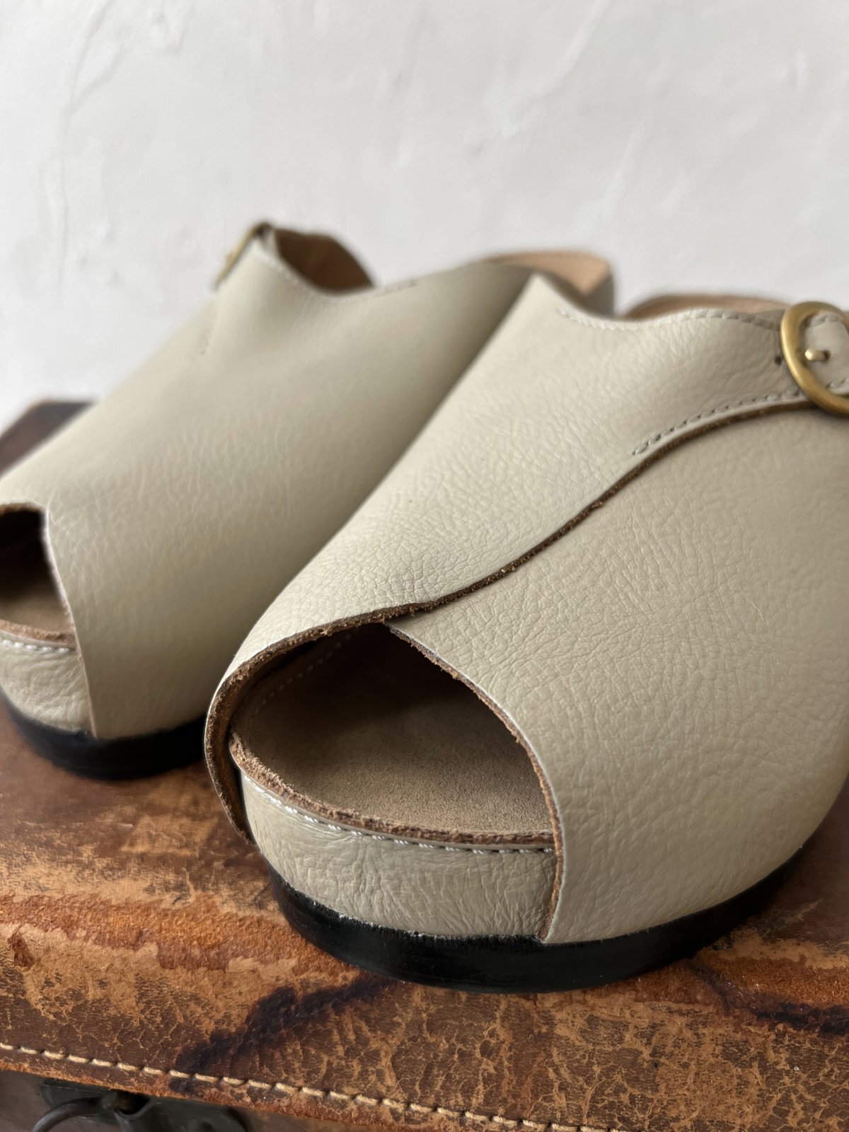 すっぽりと丸く包み込むような形のレザーサンダル。