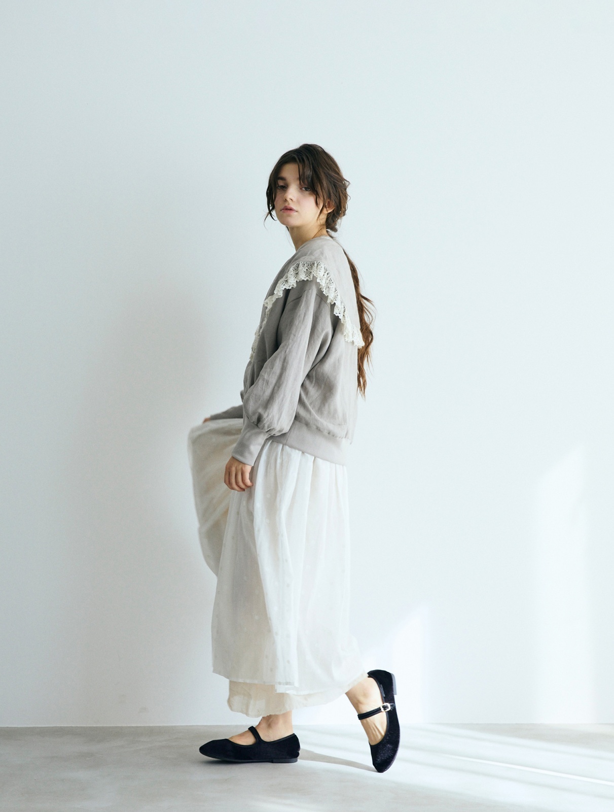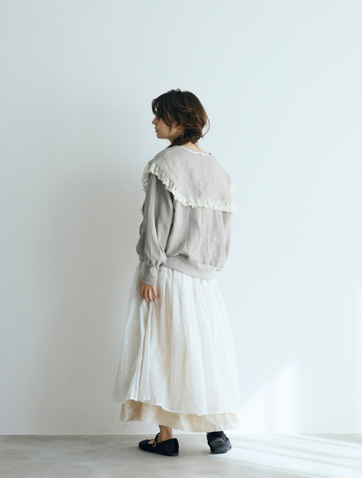 ふんわりと大きなセーラー衿と、繊細なレースがふちどる