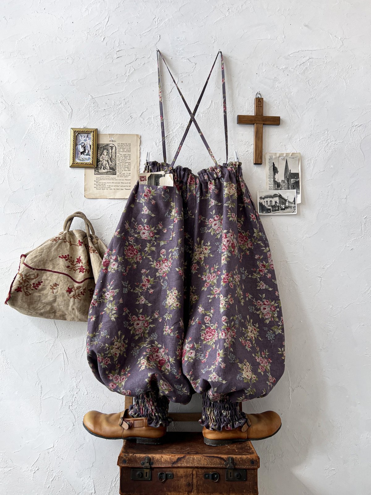 ぽわんと丸っこい形の、肩紐付きピエロパンツ。