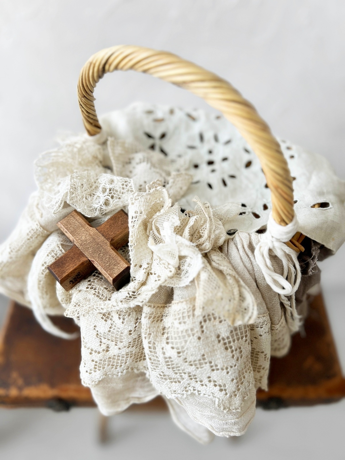 大きな木の十字架やアンティークレースをふんだんに使った
