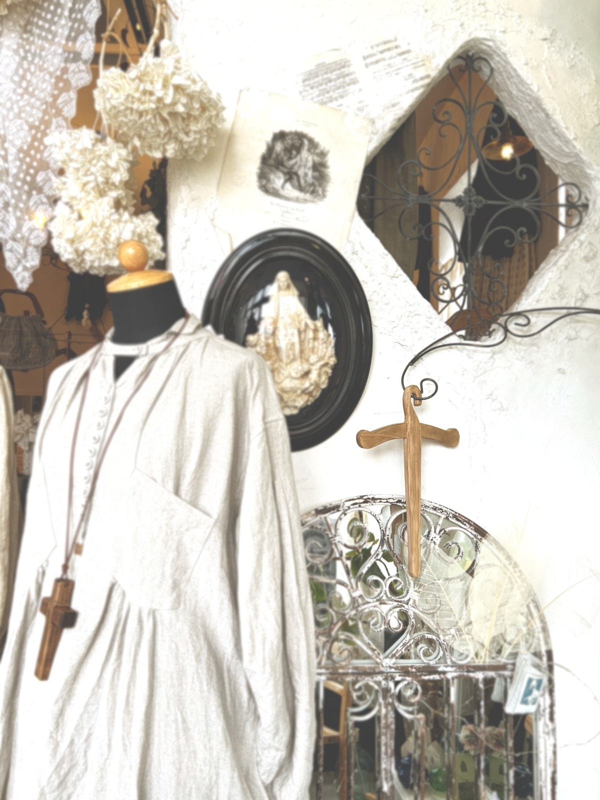 壁にかけてレースやベビードレス、付け襟、スワッグなどなど