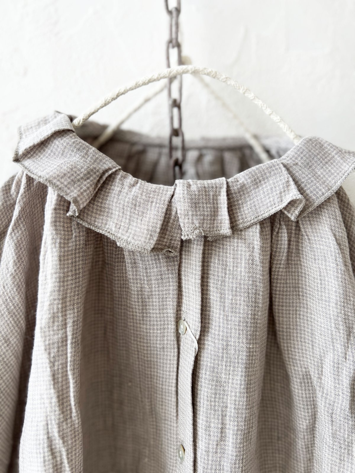 ライトグレーと生成りの細かなギンガムチェックです。