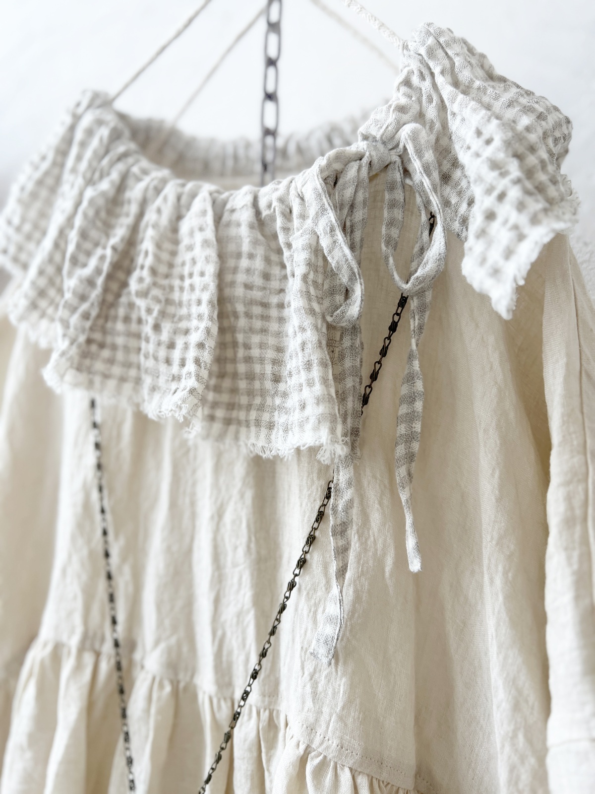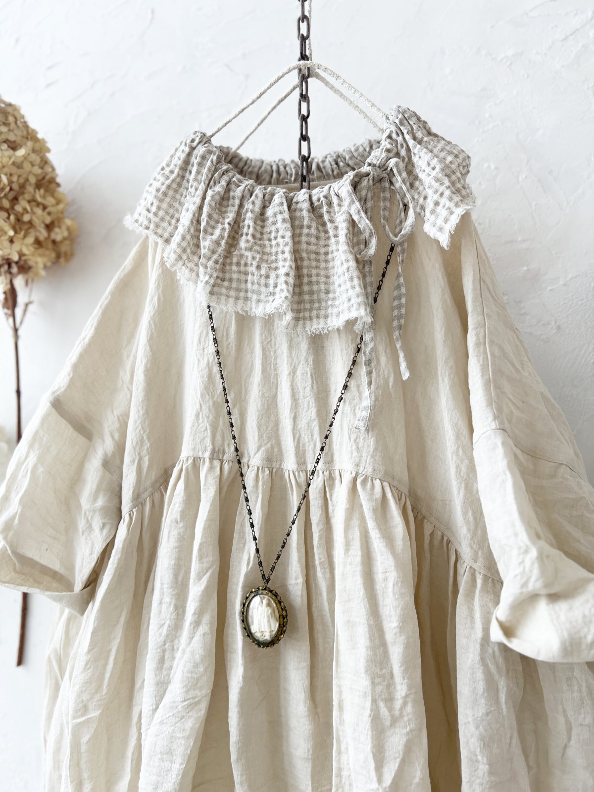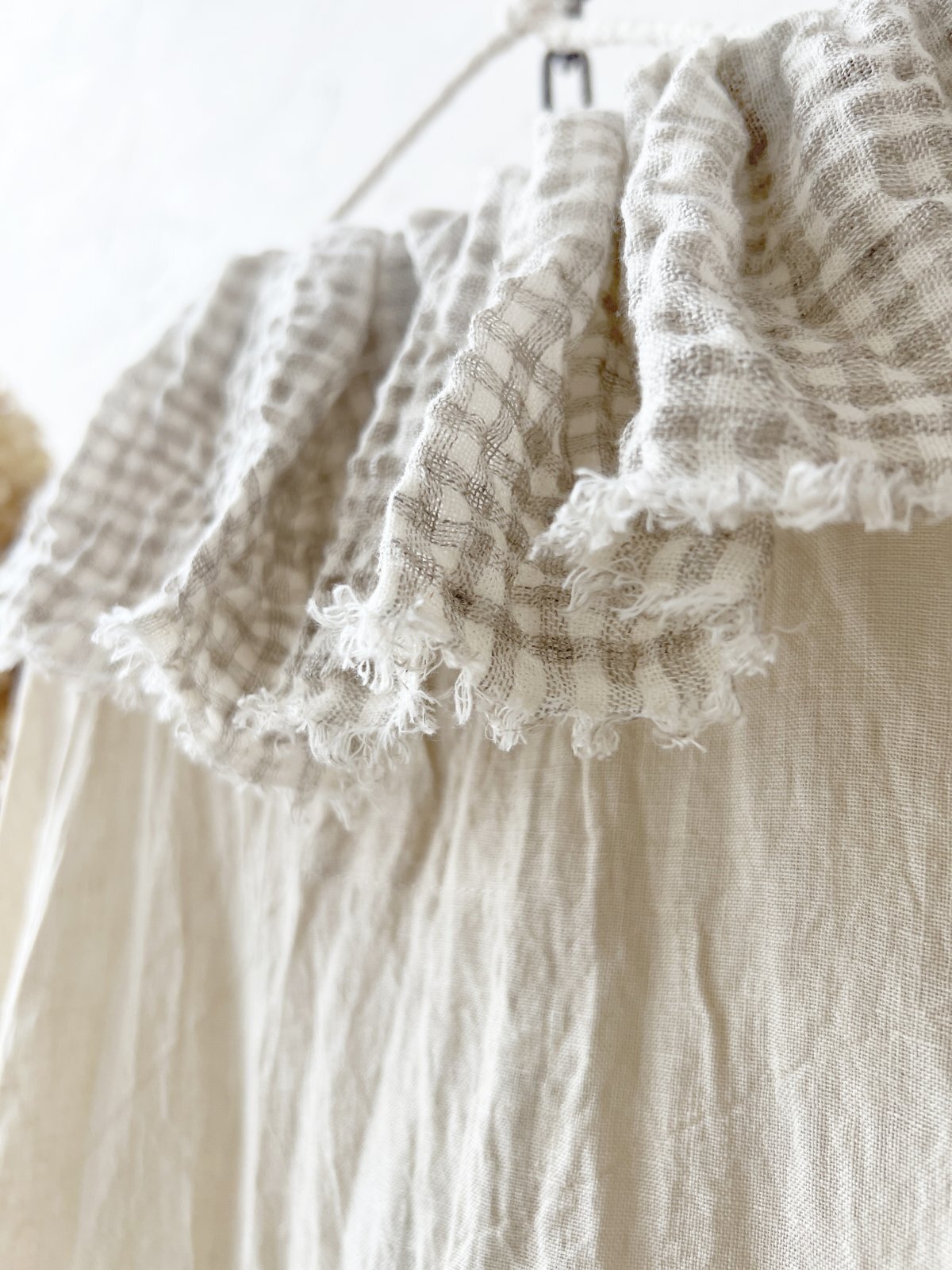 襟には ワッフルベージュのコットンリネン。