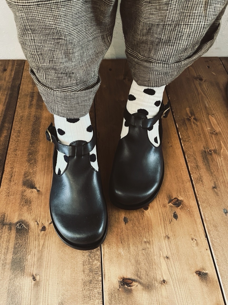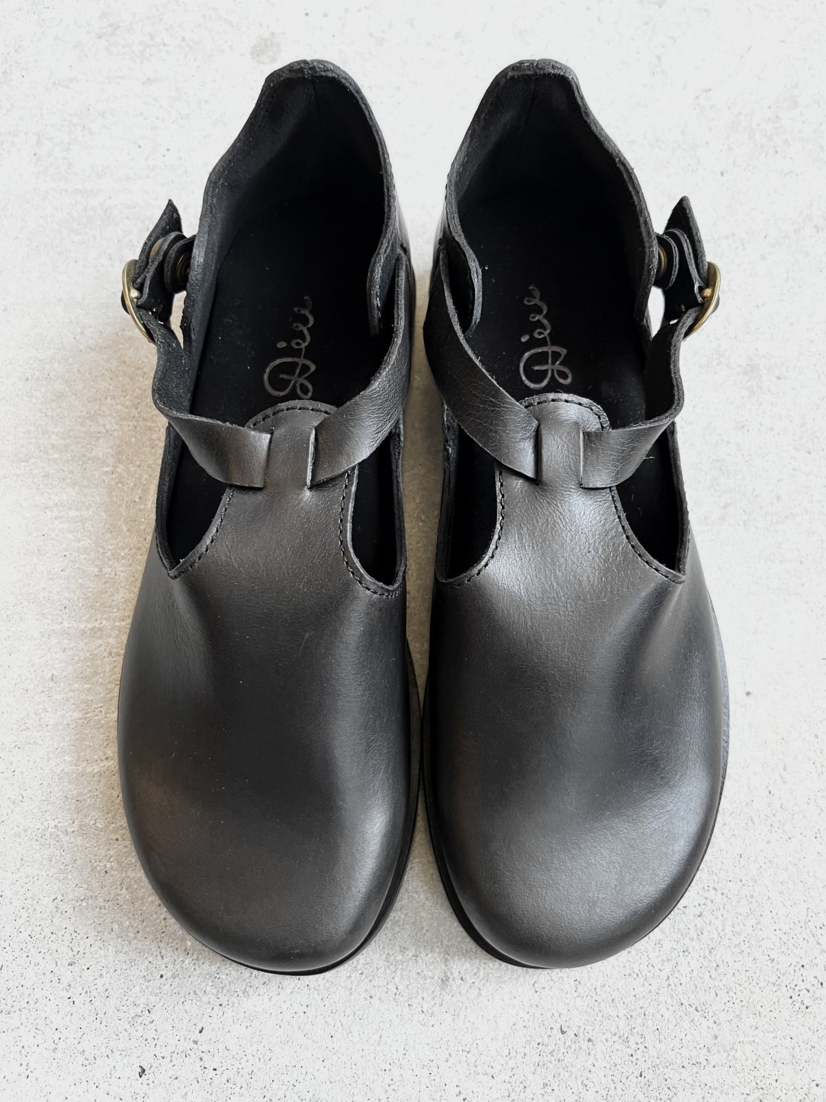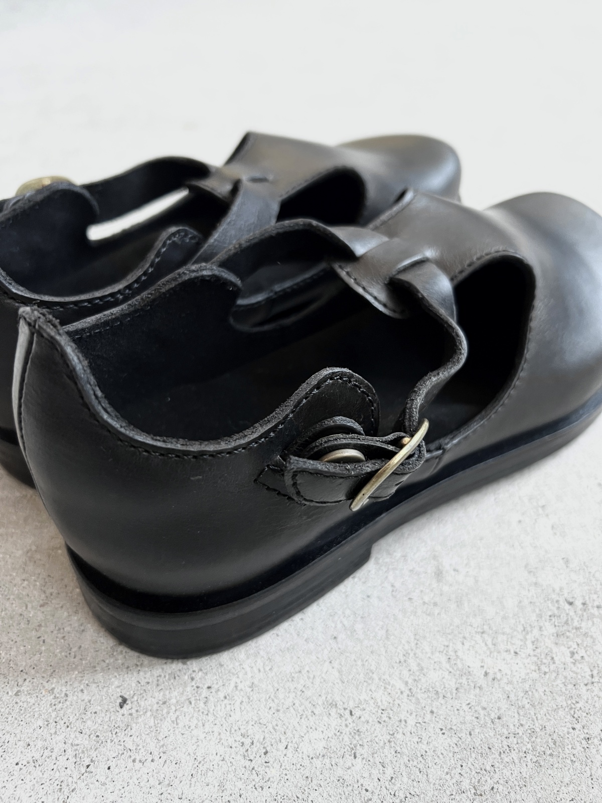 すっきりとした丸みのTストラップシューズ。
