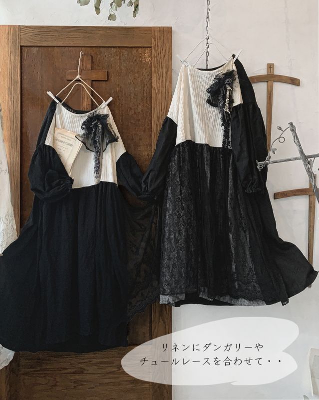 素材:本体リネン100・ピンタック部分コットン100・レース部分コットンなど