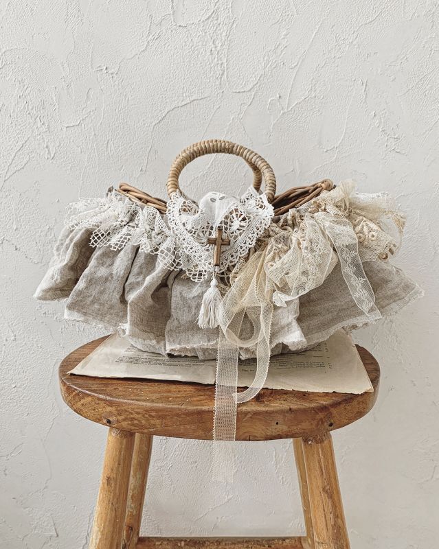 タッセル&木の十字架付きレースのカバーを上げて出し入れします。