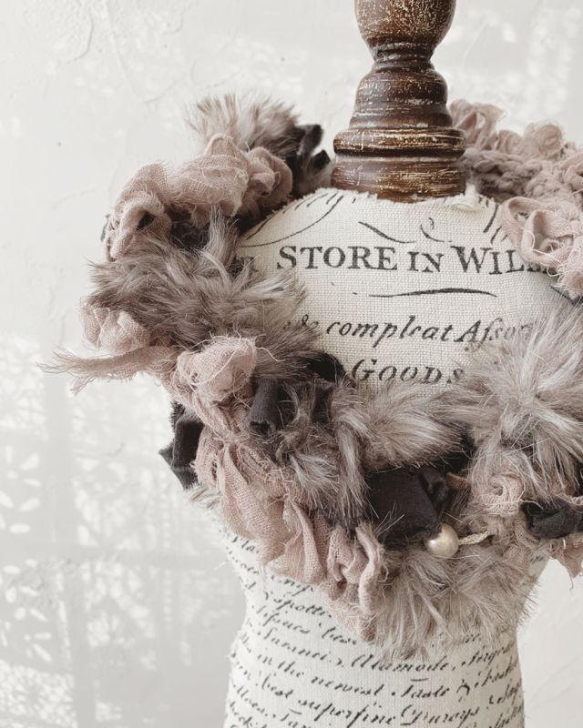 ふんわりと暖かい、優しいコットンの裂き編みとエコファーの首飾りです。
