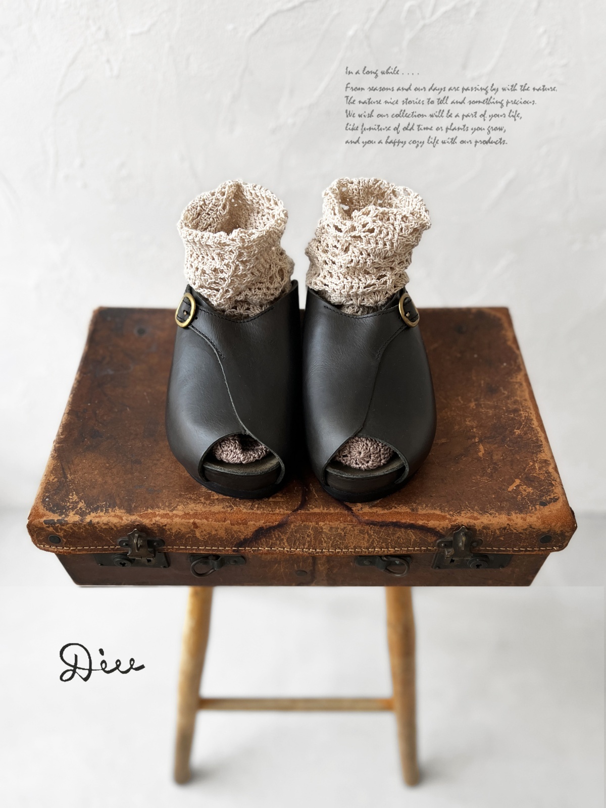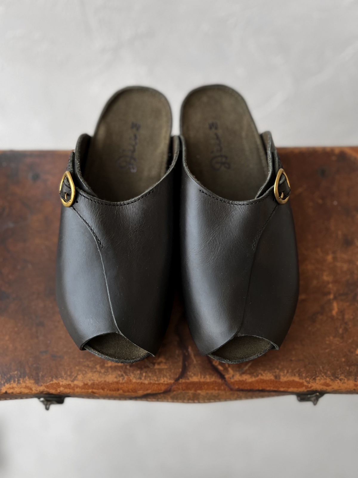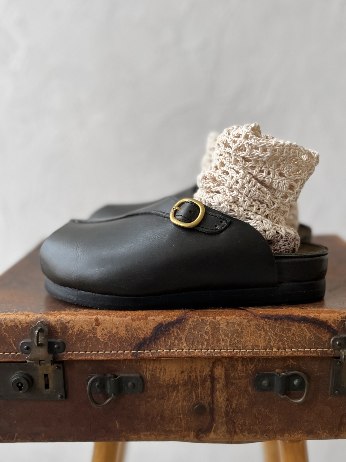 すっぽりと丸く包み込むような形のレザーサンダル。