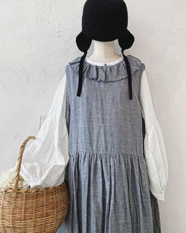 フリル襟にギャザーたっぷりのゆったりな着心地。