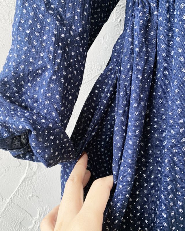 ちいさなペイズリー柄のブルーリネンに、胸元は深い濃紺。
