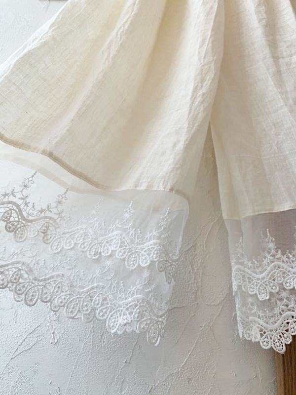 ふわふわのミルク色リネンに、裾には大きなスカラップレース。