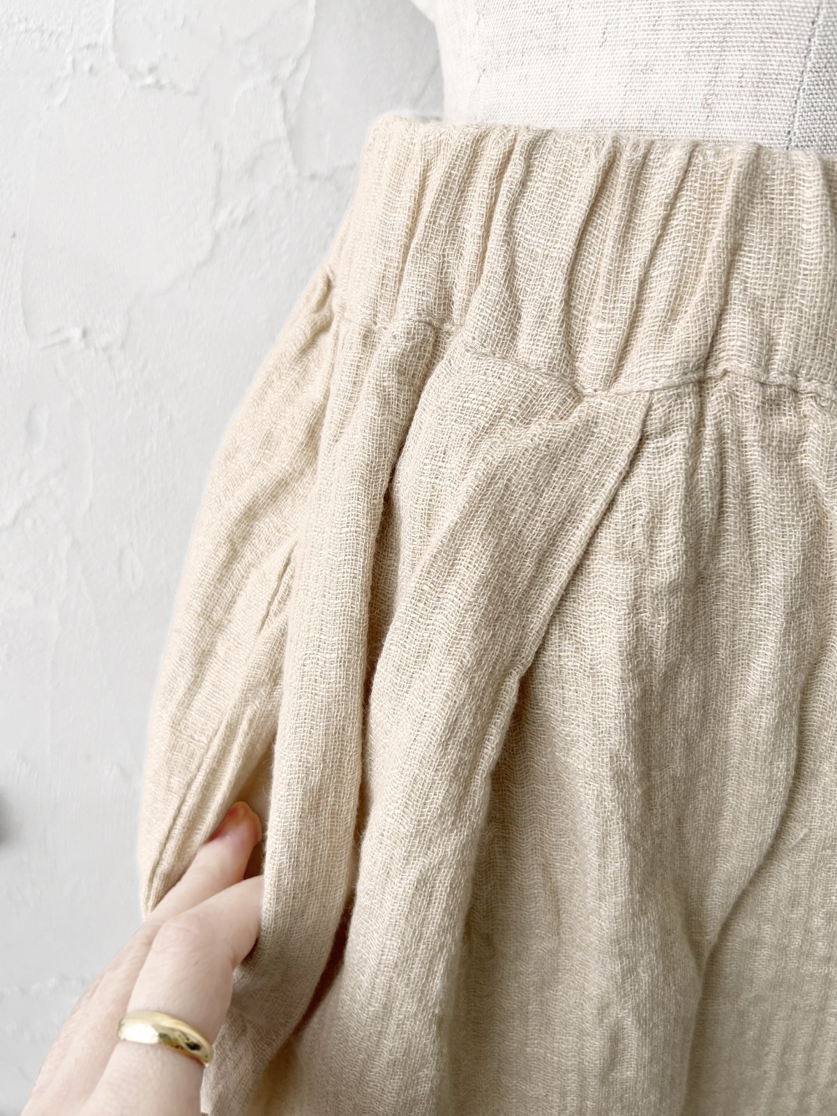 ウエスト総ゴム+内紐つき。リネンとコットンのWガーゼ素材で、