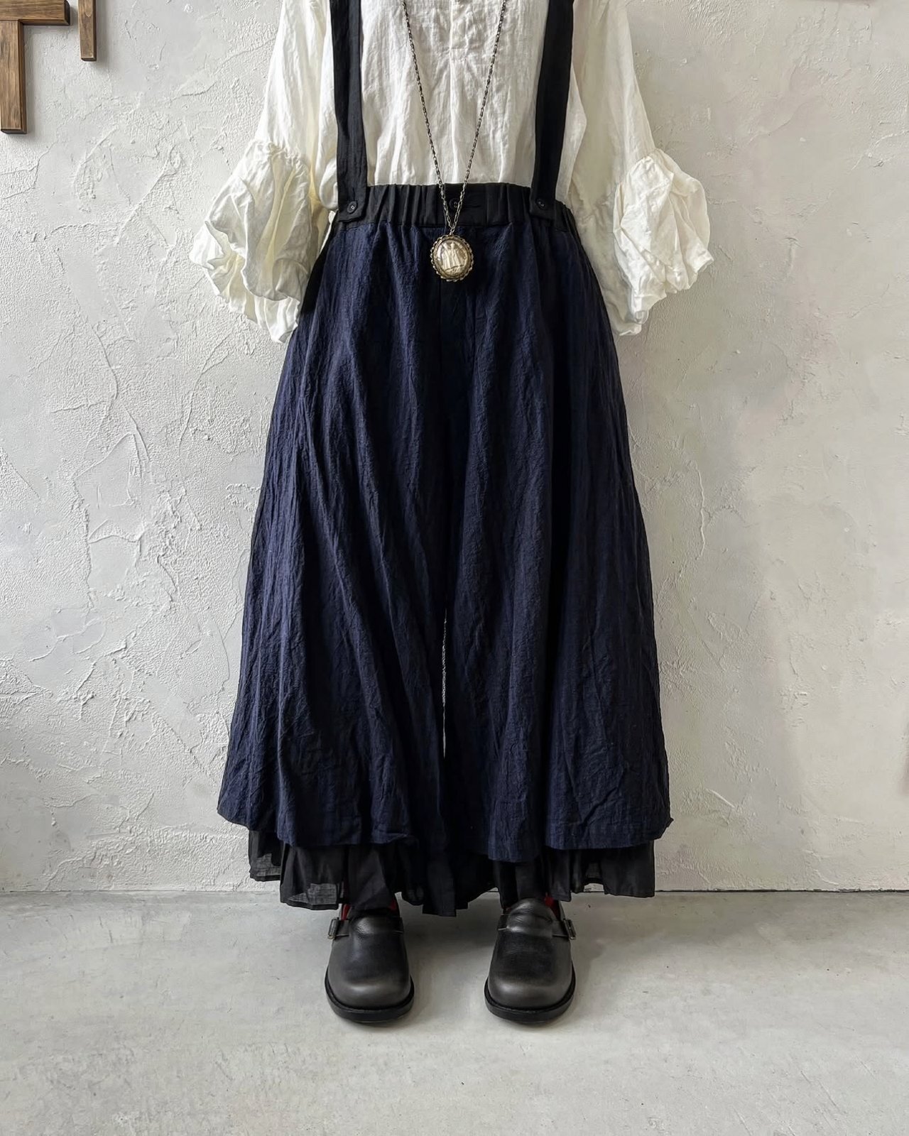 裾に重なるレイヤードが特徴の2枚仕立てサスペンダーパンツです。