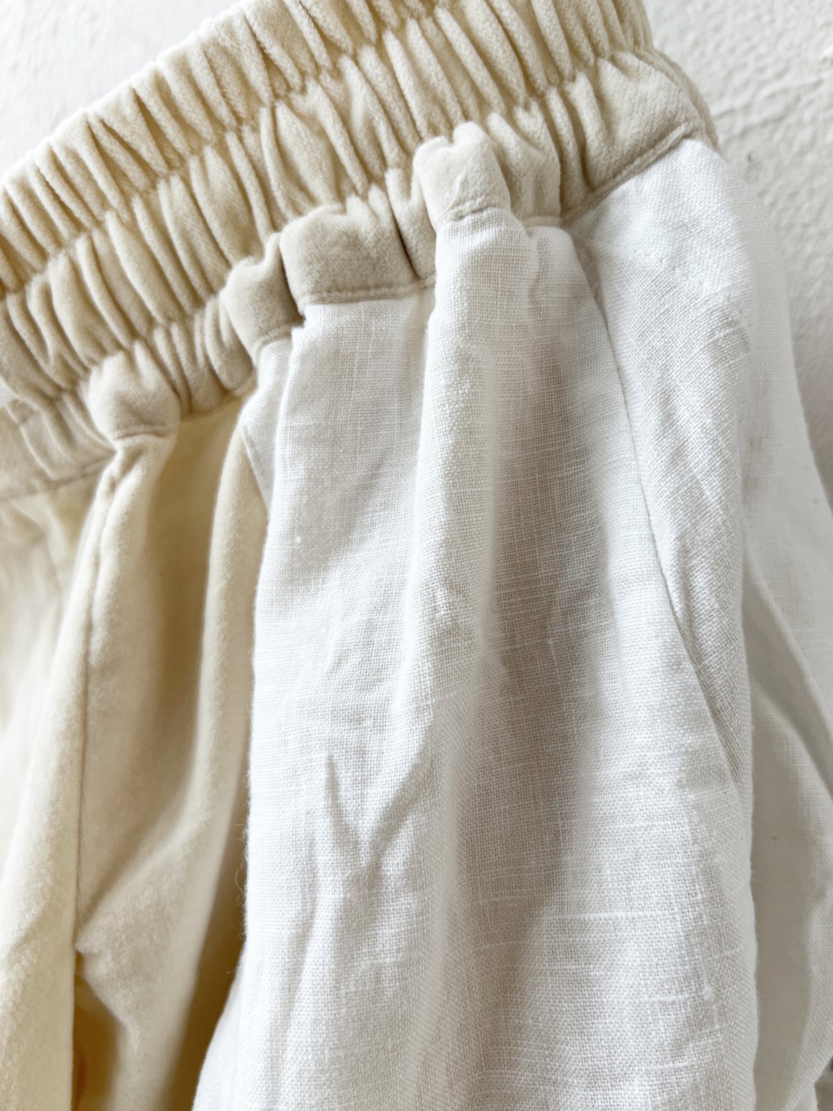 ウエストは総ゴムで楽ちん、リボンで締めることもできます。