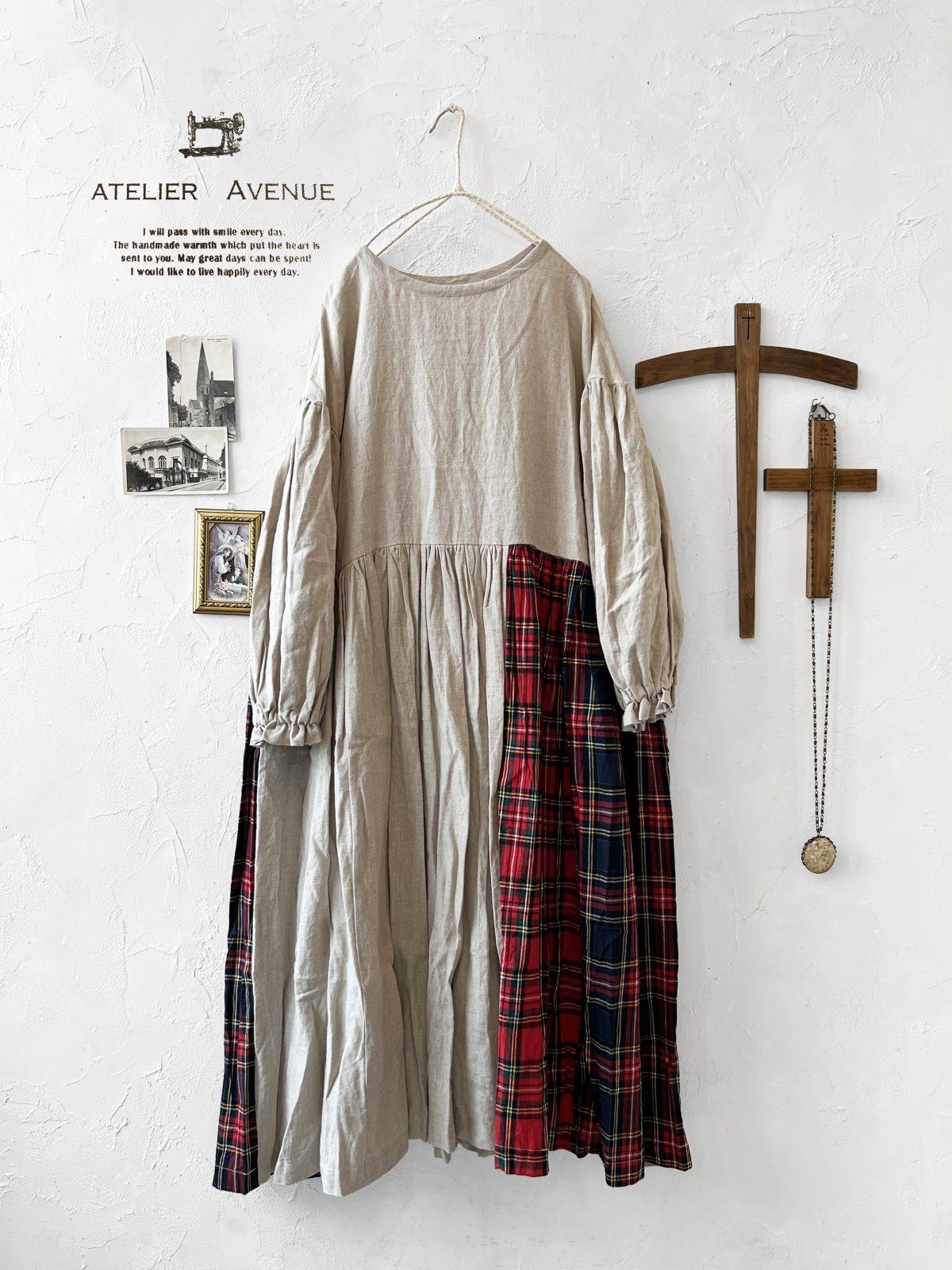 Avenue/赤チェック切り替えギャザーワンピース・生成り [AVE250903]