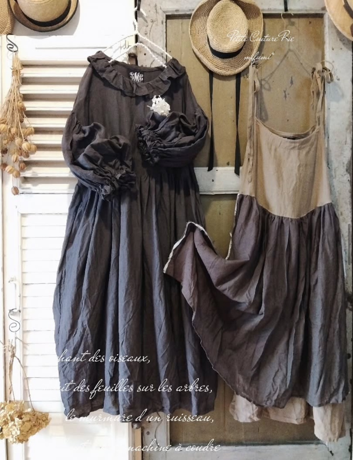 mifumi/フリル襟ドロップショルダーpuffワンピース・こげ茶 [MIF251032]